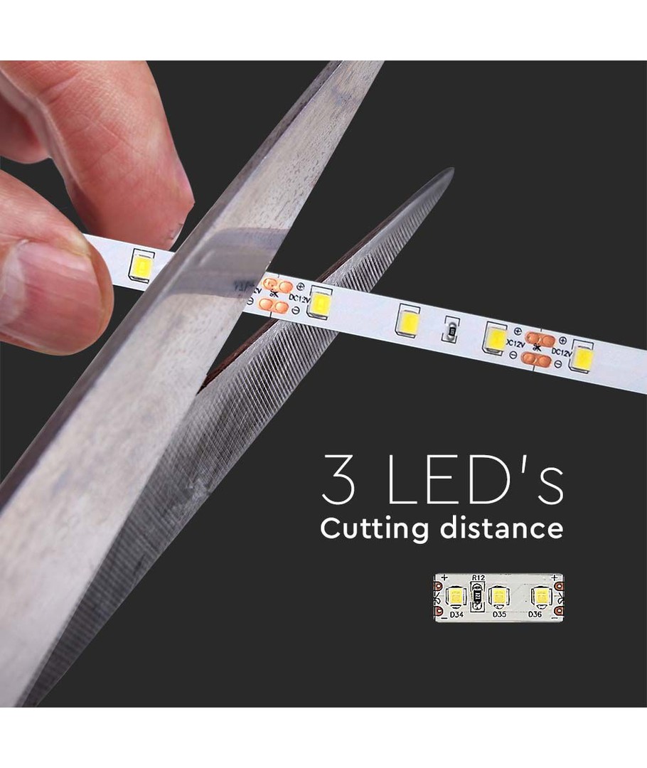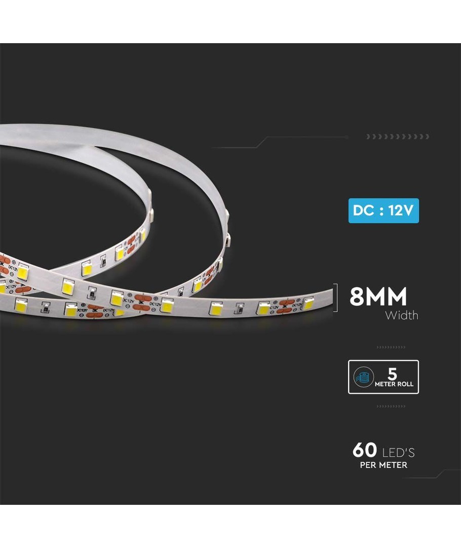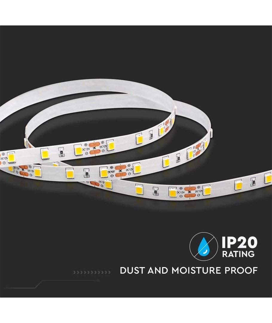V-Tac LED Stripe krever en 12V DC forsyning for drift, og den kommer med en IP20 rating, noe som betyr at den ikke er vannbestandig og bør brukes innendørs. Gitt disse spesifikasjonene, er den ideell for belysning av skap, hyller og andre tørre områder i hjemmet.