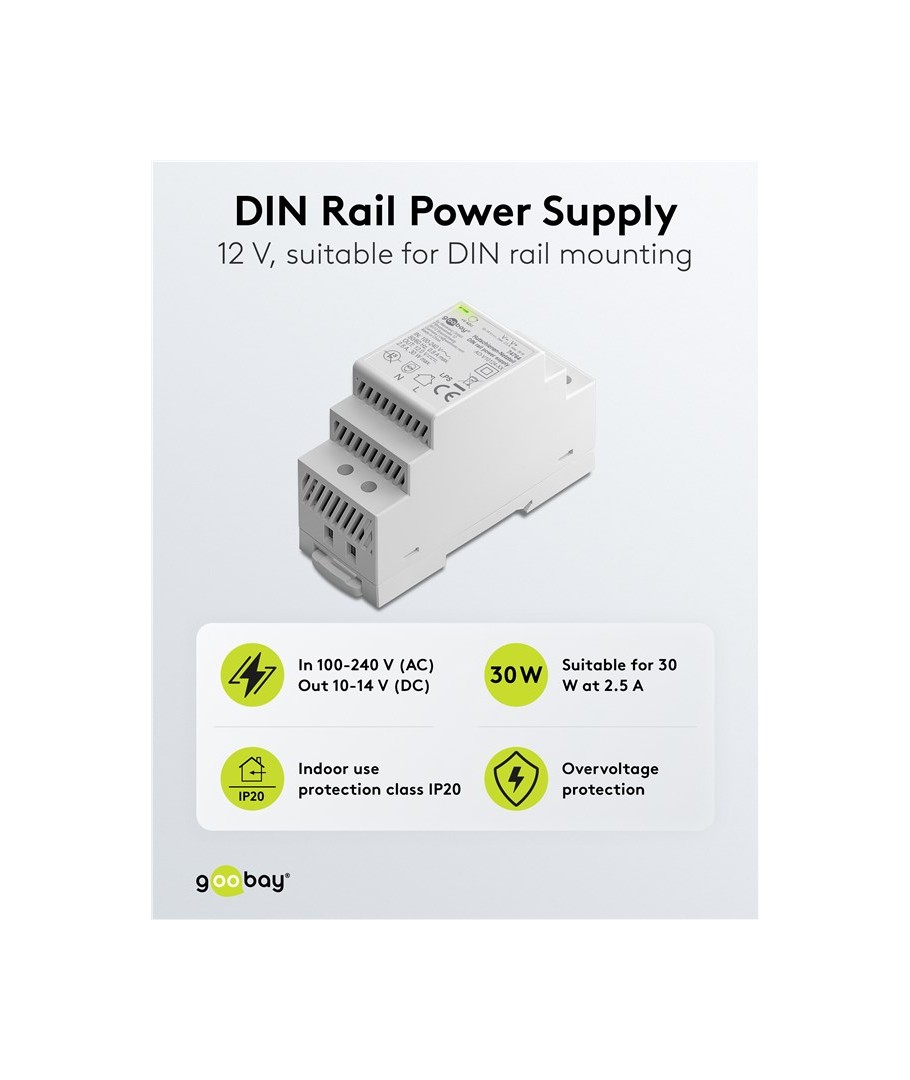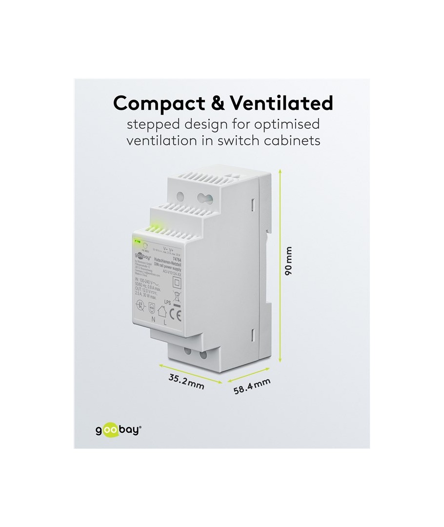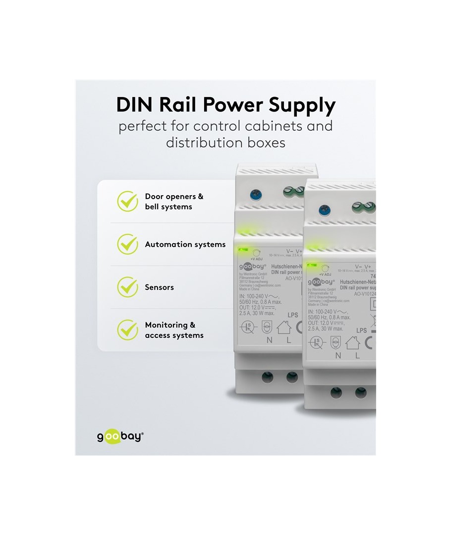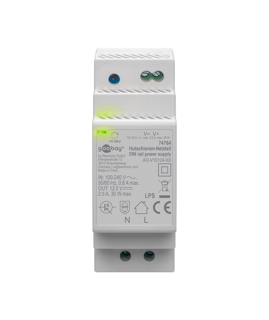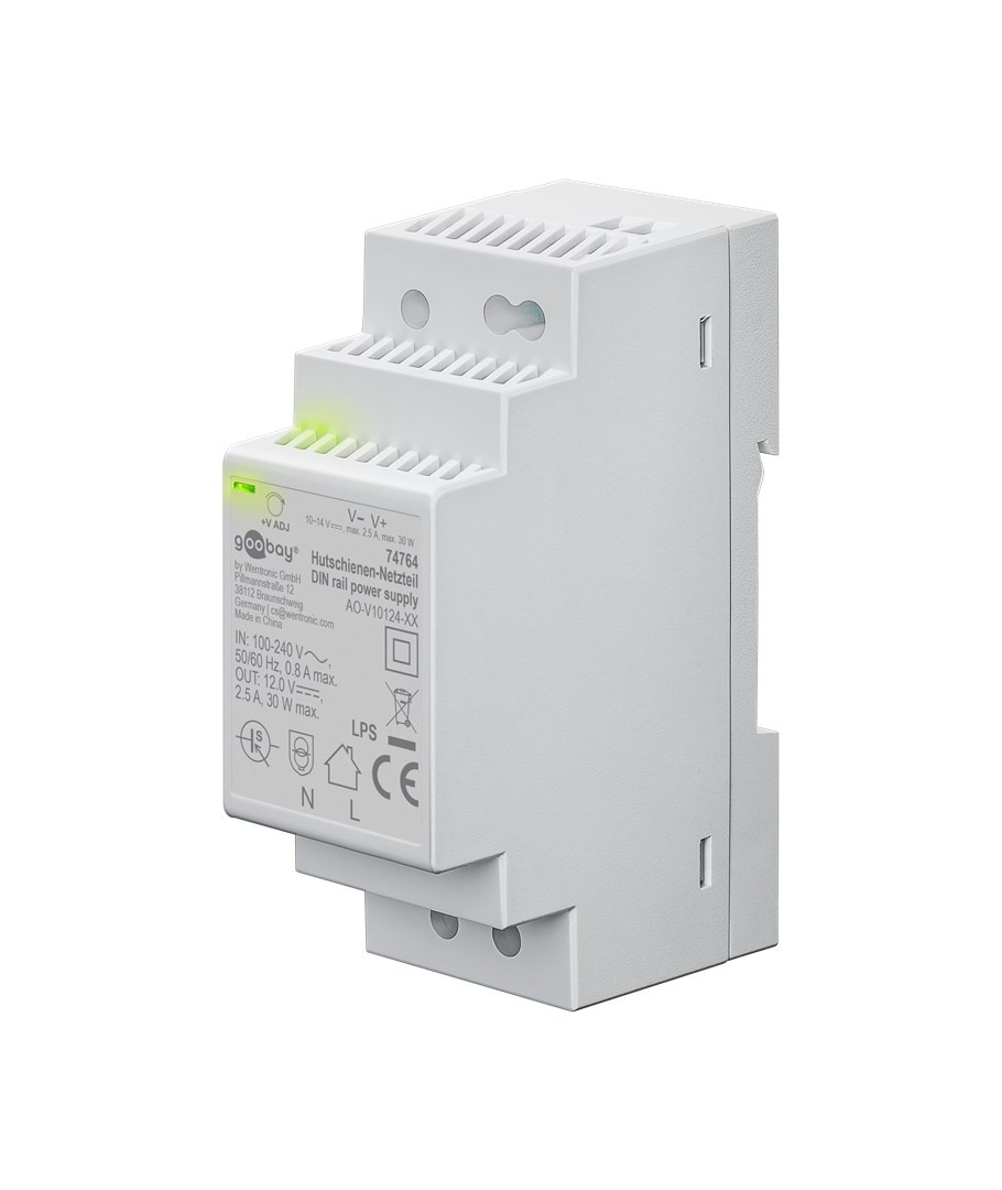 12V DC 2,5A strømforsyning for DIN skinne montering.
