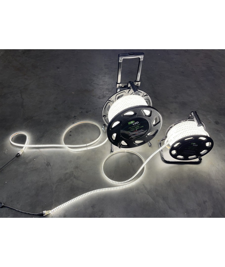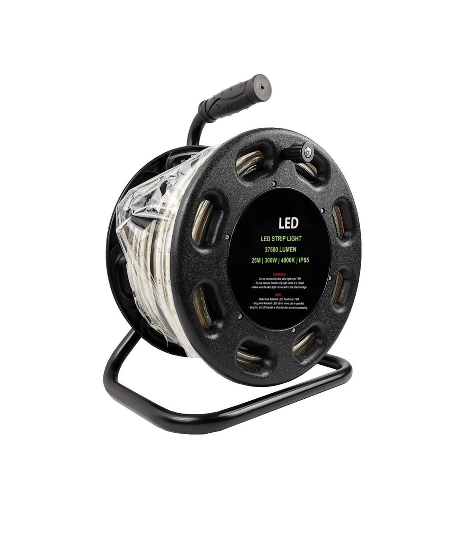 Den leveres på trommel og 25 meter LED stripe. I tillegg medfølger også en 4 meter kraftig gummikabel med godkjent EU-stikk.