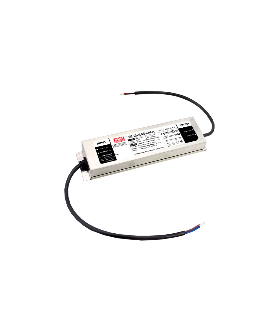 Dimbar kvalitets LED strømforsyning fra Mean Well for 230VAC. Mixed Mode utgang (spenningsstabilisert til maksimalstrøm med etterfølgende strømstabilisering C.V. + C.C.), LED driveren er IP67 godkjent for innendørs og utendørs bruk.
