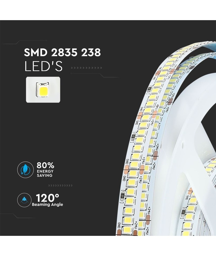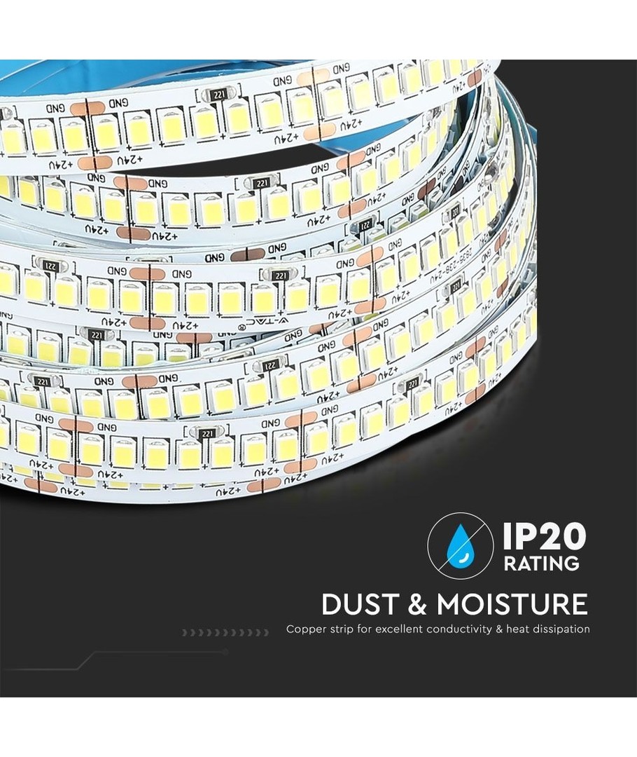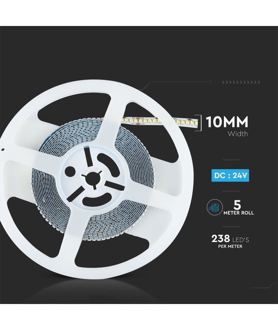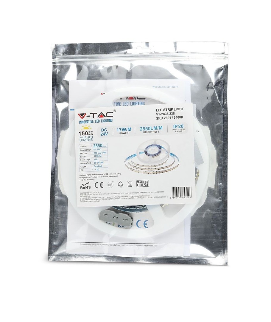 V-Tac LED-stripen tilbyr høy lyskvalitet med en RA-verdi på 80-85, noe som sikrer at farger vises med naturlig intensitet. Dette nivået av lyskvalitet er mer enn tilstrekkelig for de aller fleste behov, fra hjem til kommersielle rom.