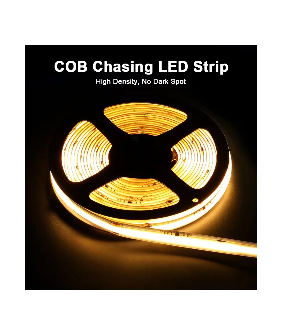 Opplev den fantastiske lysopplevelsen med vår COB LED strip, designet for både estetikk og funksjon. Denne strimmen har løpelys egenskaper og består av 120 LED per meter.