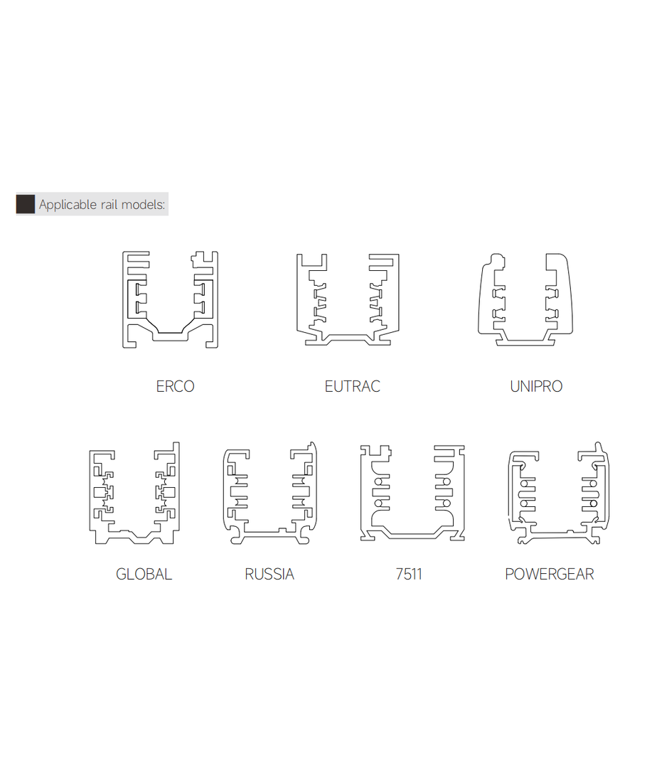 Passer til standard 3-faset (4 wire) skinner, samt Global skinner og IKEA Skeninge.
