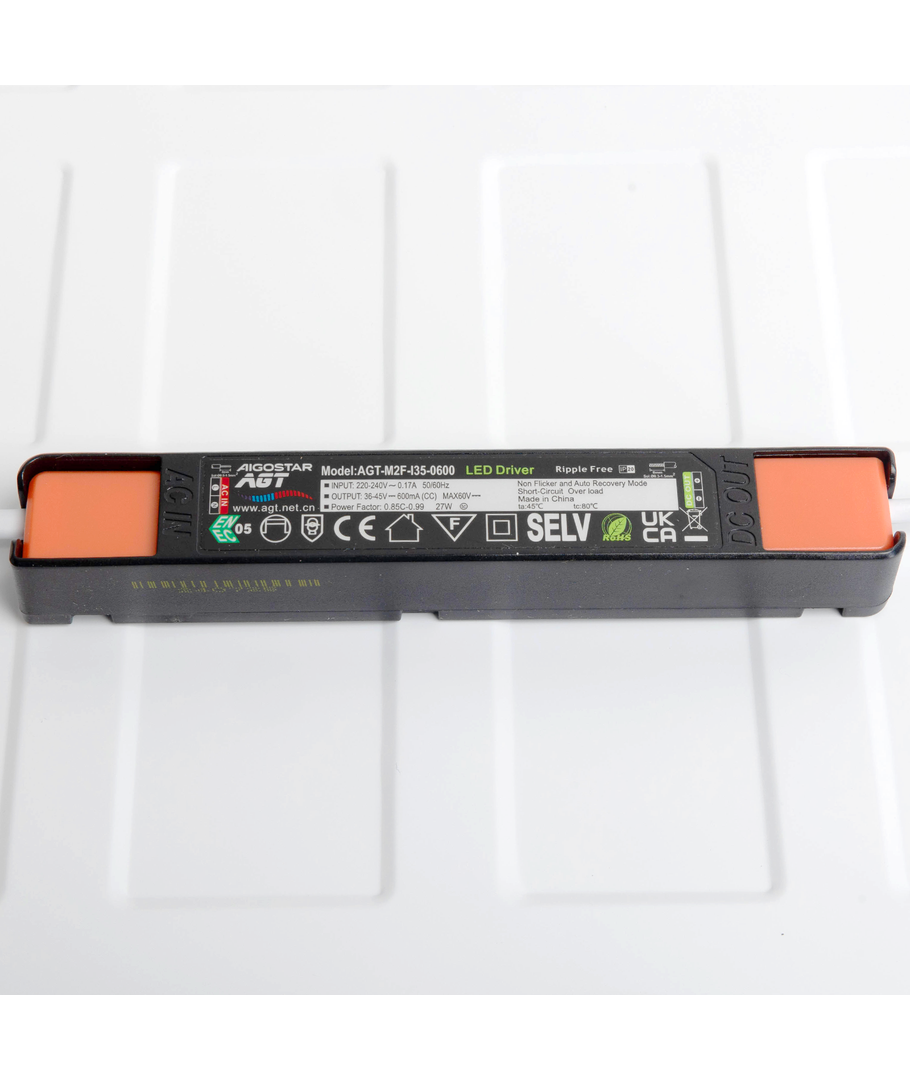 Panelet leveres komplett med en ikke dimbar driver (36-45V 600mA), som kan tilkobles 230V.