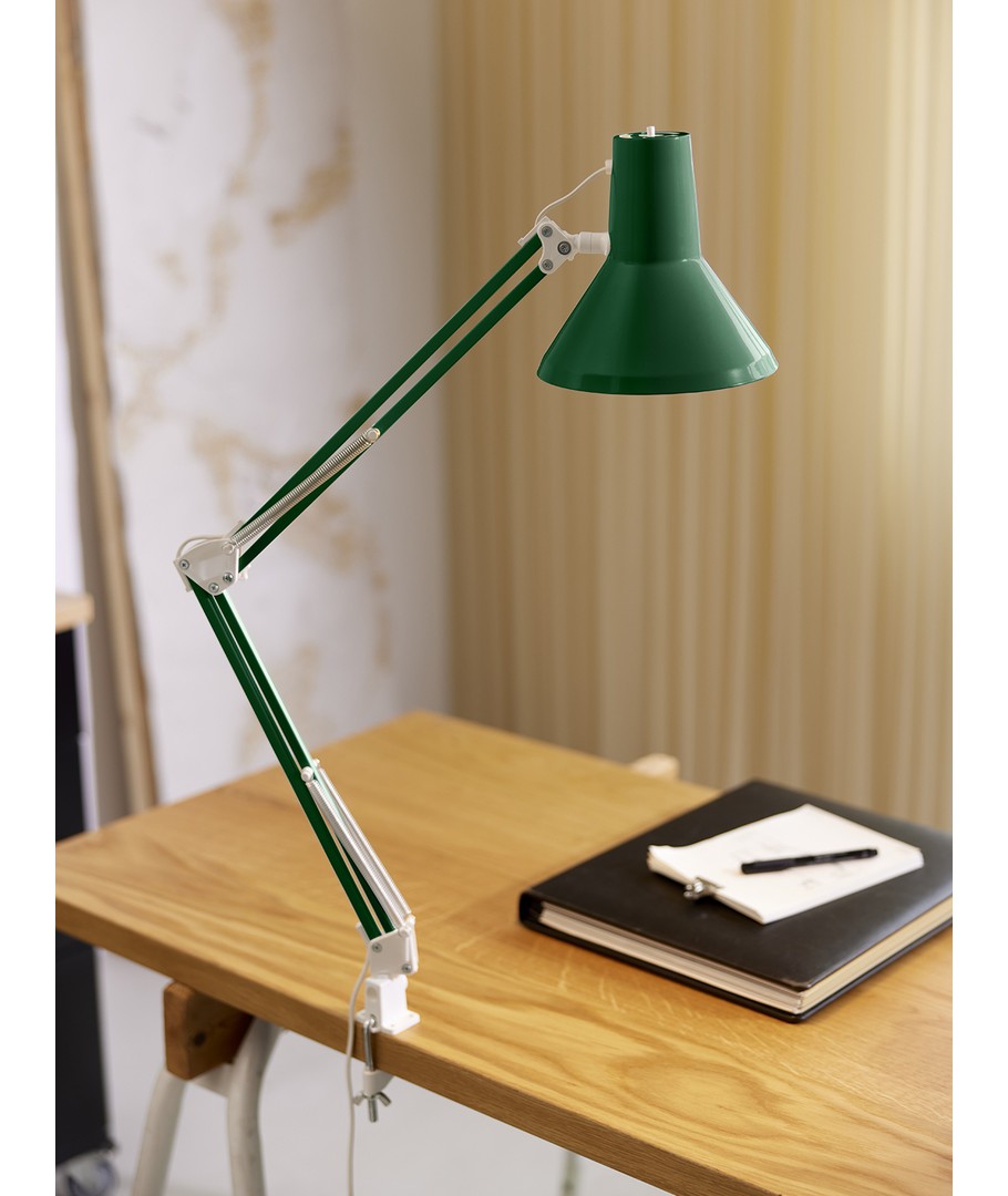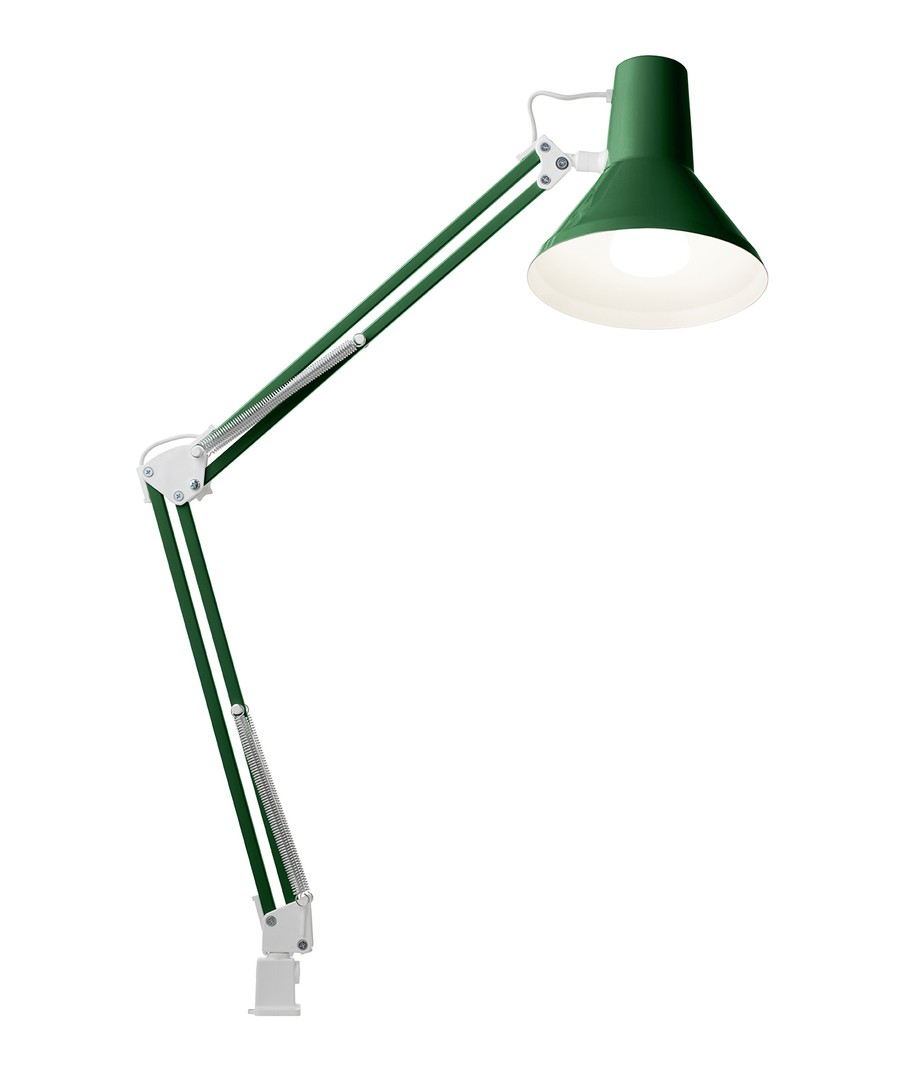 Jensen arkitektlampe i grønn fra Nielsen Light, er den originale, klassiske arkitektlampe med 4 kraftige fjærer og hode i ett stykke metall. Lampen leveres inkludert bordklemme og veggbeslag, så den er enkel å montere på skrivebordet eller på en vegg.