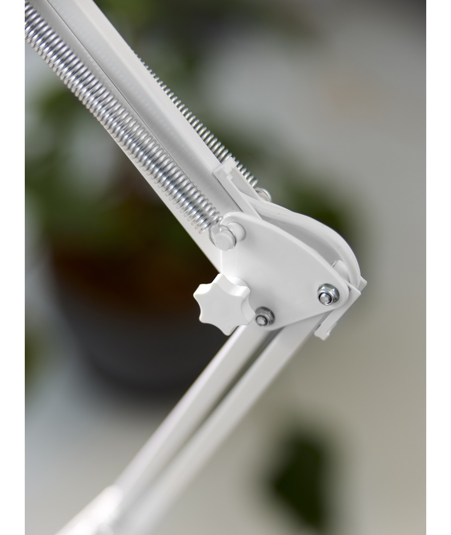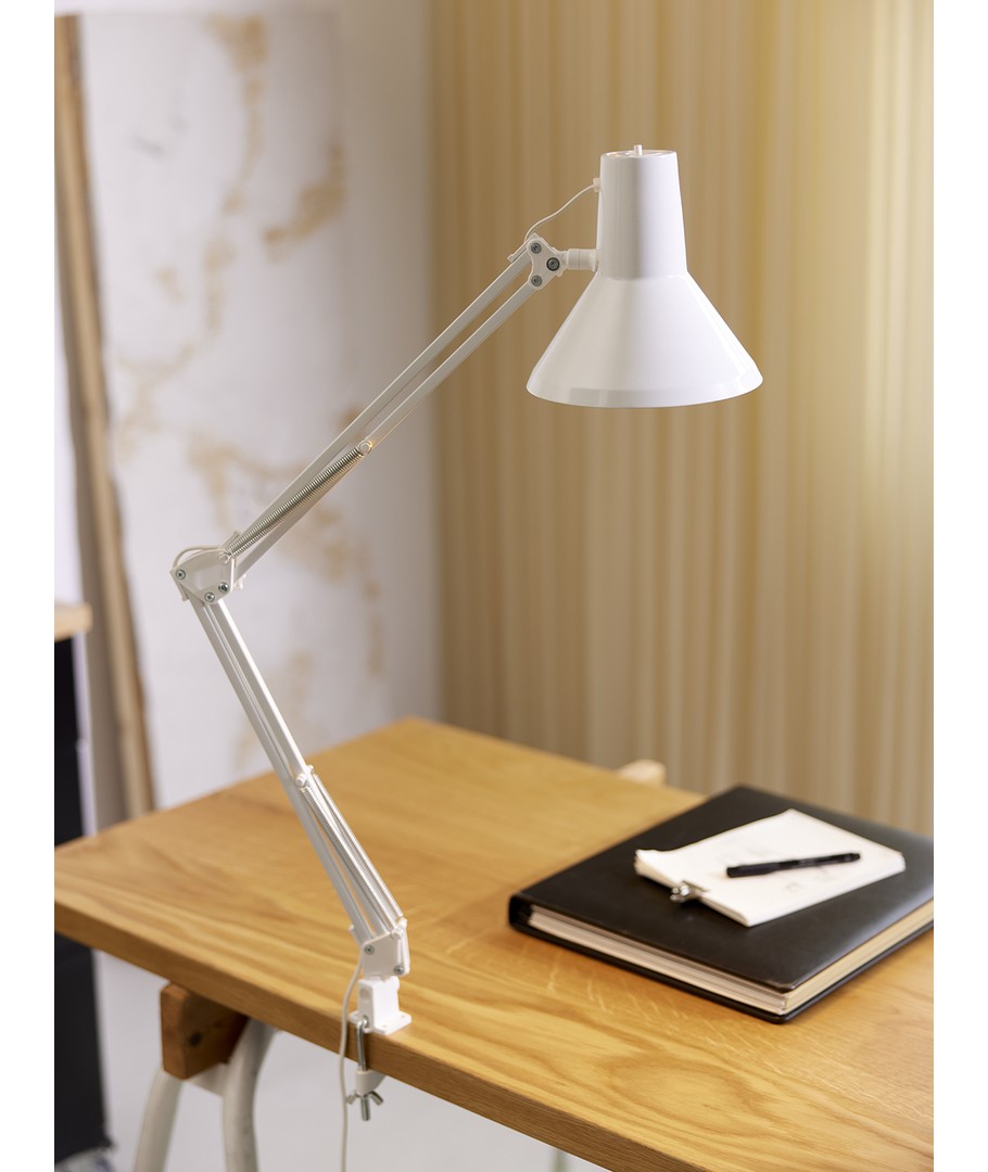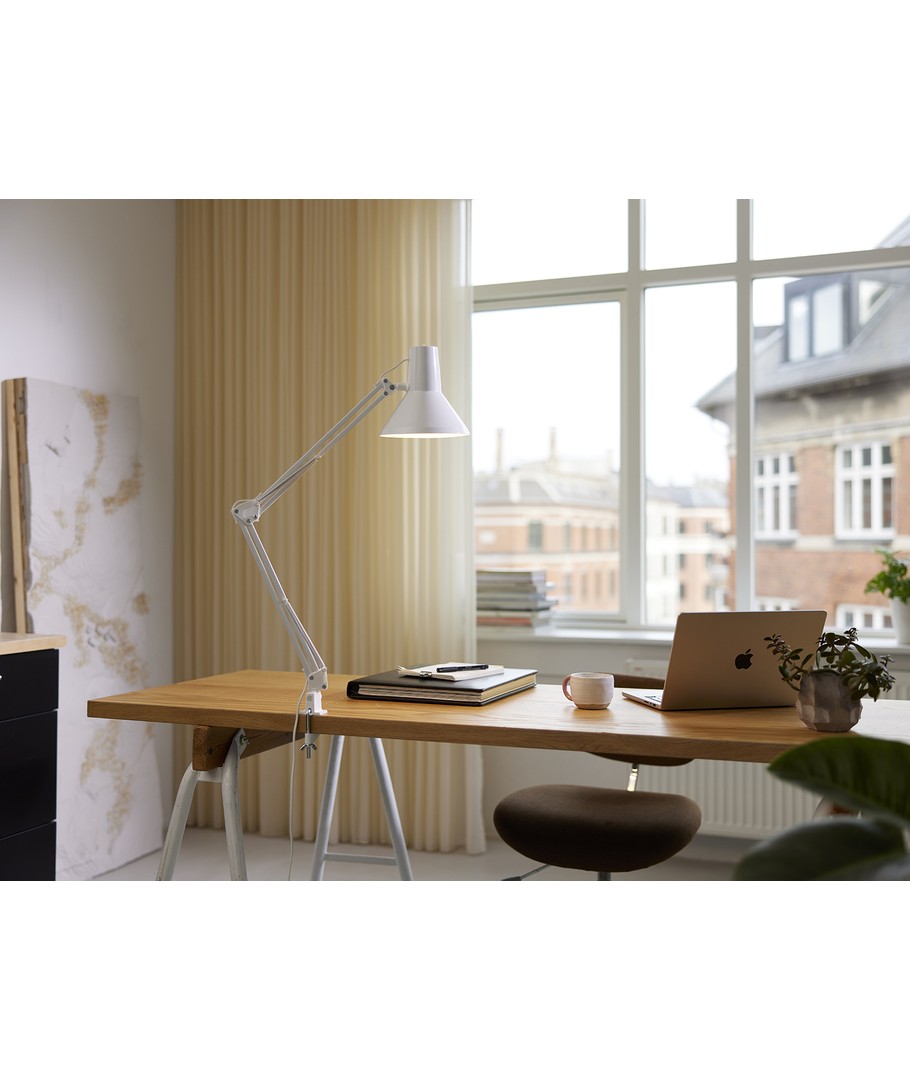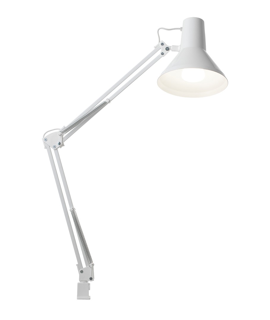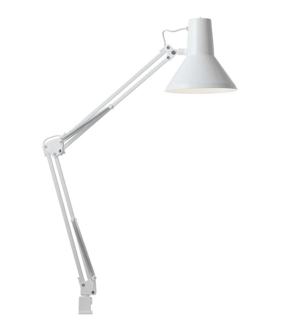 Jensen arkitektlampe i hvit fra Nielsen Light, er den originale, klassiske arkitektlampe med 4 kraftige fjærer og hode i et stykke metall. Lampen leveres inkludert bordklemme og veggfeste, så den er enkel å montere på skrivebordet eller på en vegg.