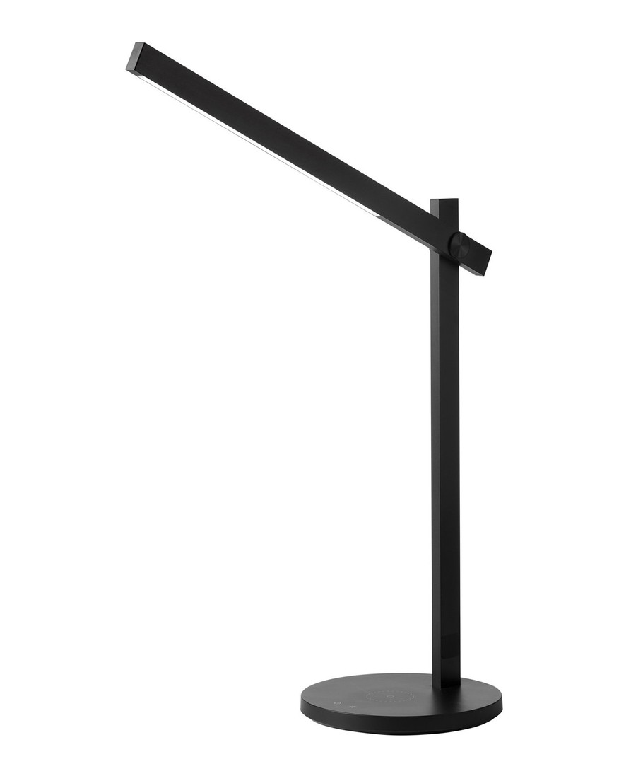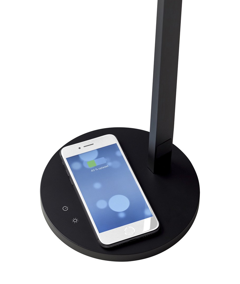 Enkel, stilren og smart LED bordlampe i svart og med 3-trinns Touch dim på lampen fra Nielsen Light. Leveres med innebygd mobillader, så du bare kan legge mobilen på lampens fot, og så lader den trådløst.
