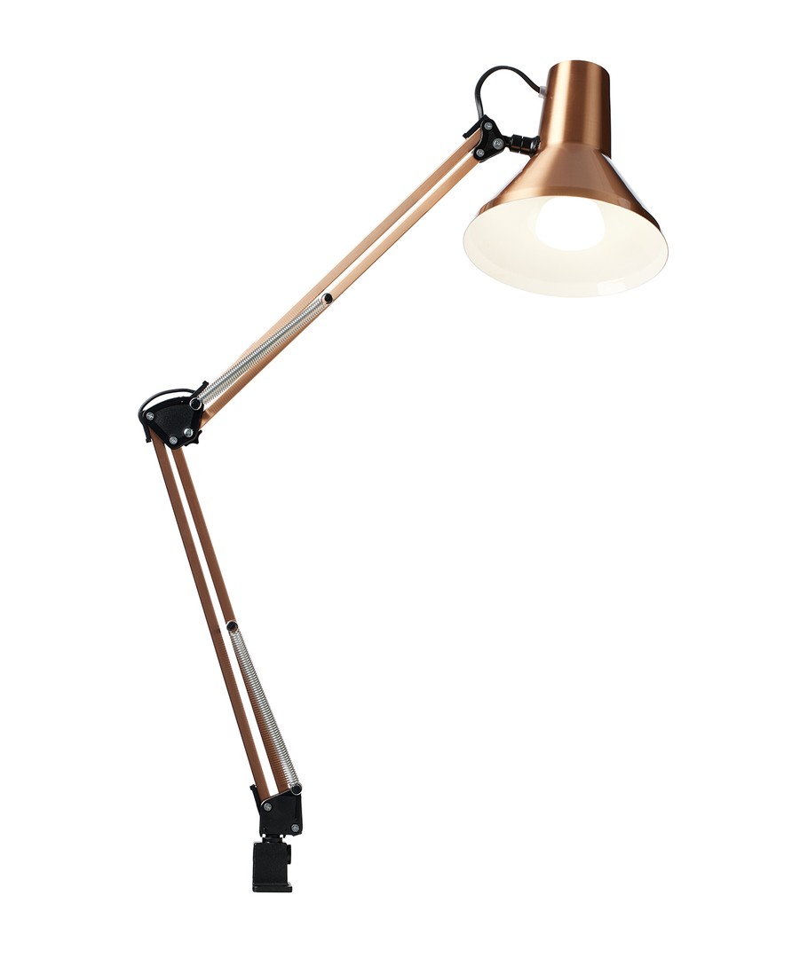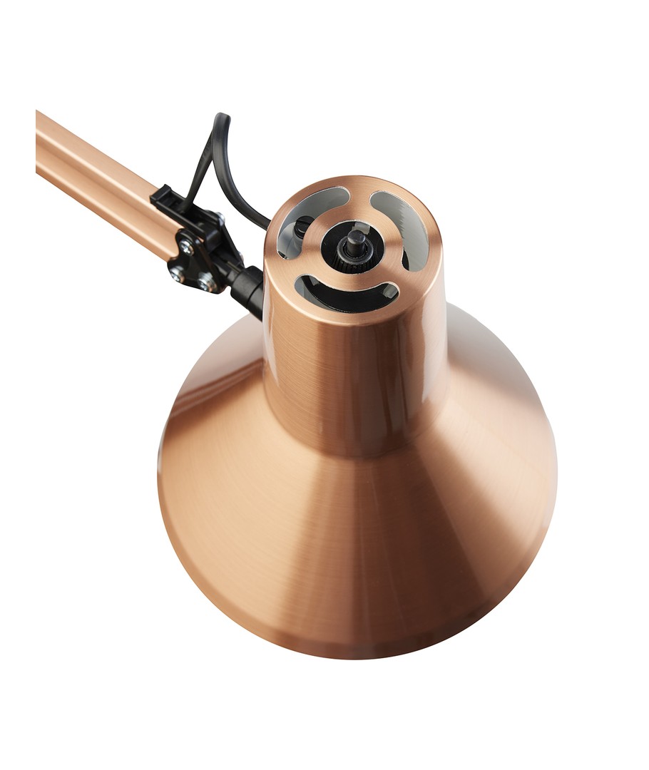 Jensen arkitektlampe i børstet kobber fra Nielsen Light, er den originale, klassiske arkitektlampe med 4 kraftige fjærer og hode i et stykke metall. Lampen leveres inkludert bordklemme og veggfeste, så den er enkel å montere på skrivebordet eller på en vegg.