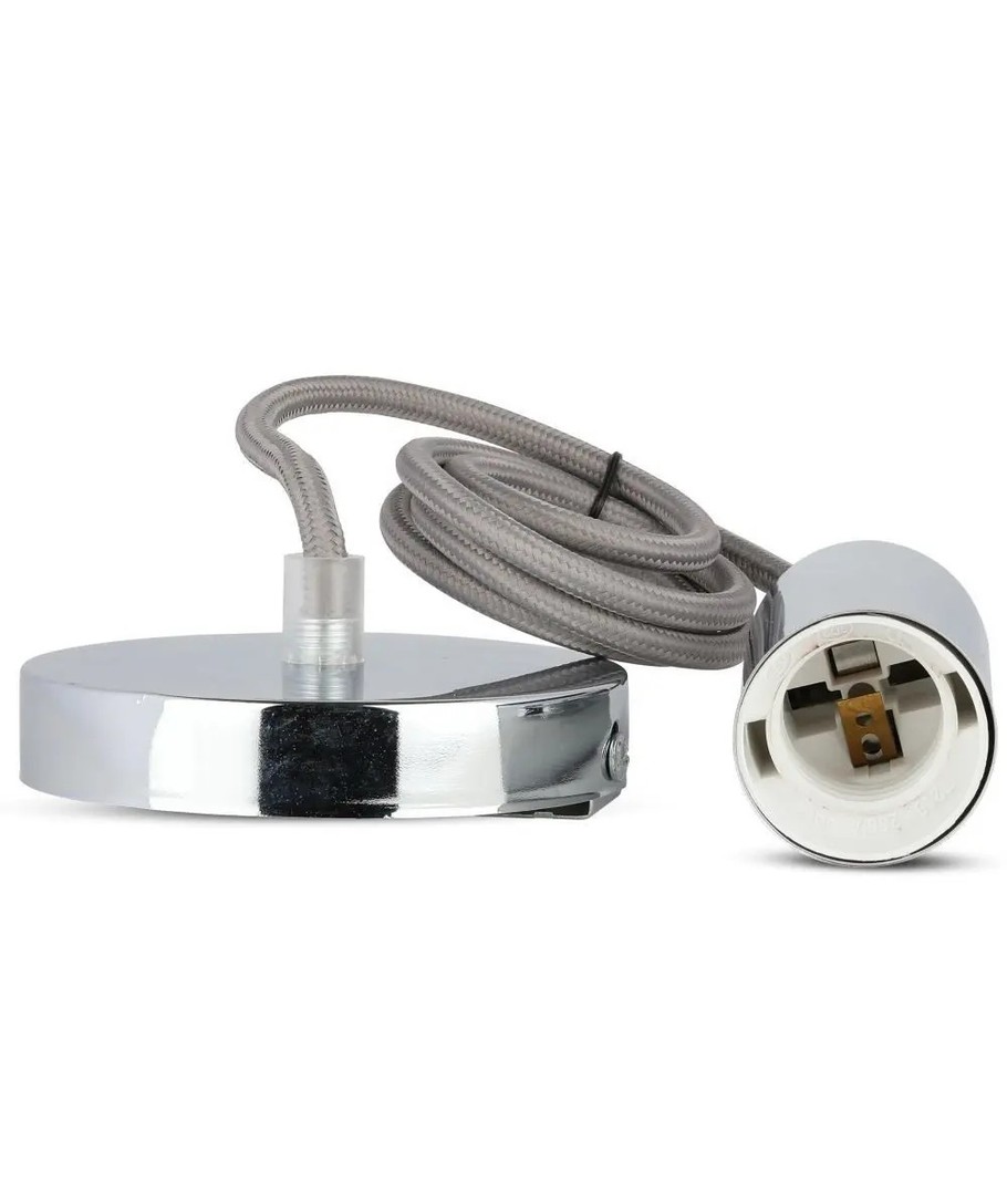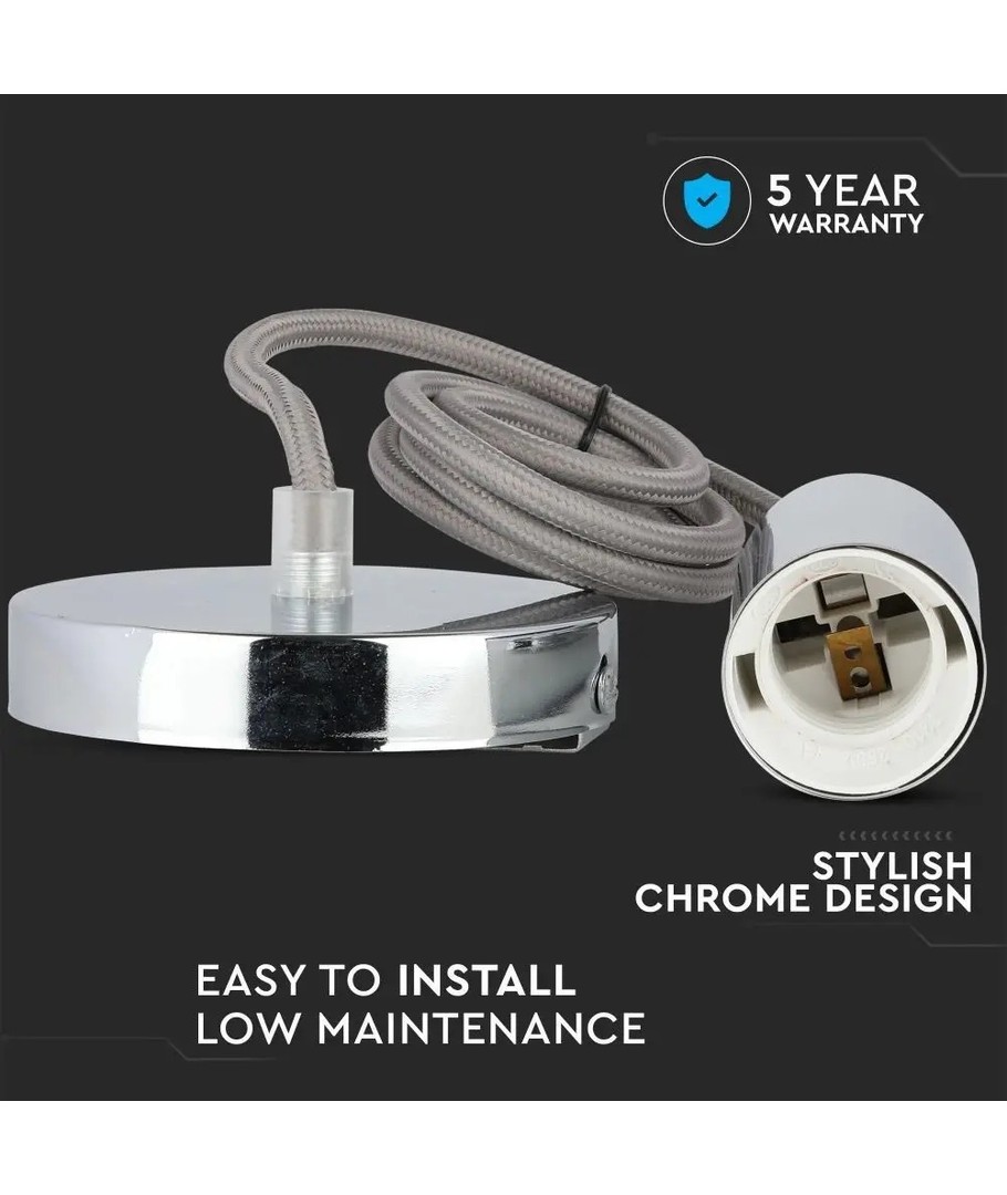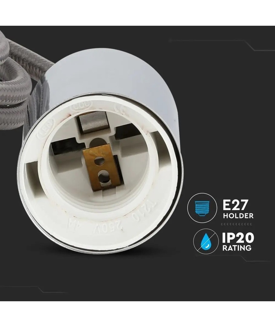 Fatningens minimalistiske design fremheves av grå ledning, som gir en diskret og ren utseende. Metallet i krom er ikke bare slitesterkt, men gir også et moderne uttrykk som passer til enhver interiørstil.