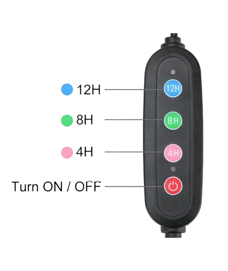 Vekstlyset kan også innstilles med timer slik at lyset blir skrudd av etter 4, 8 eller 12 timer.