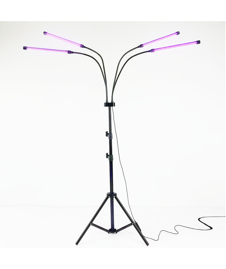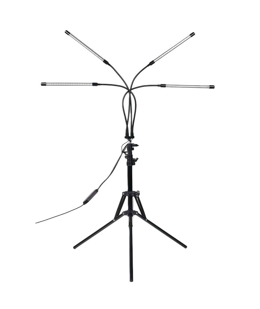 Kan innstilles i høyden, og har fleksible armer til de 4 lampene.