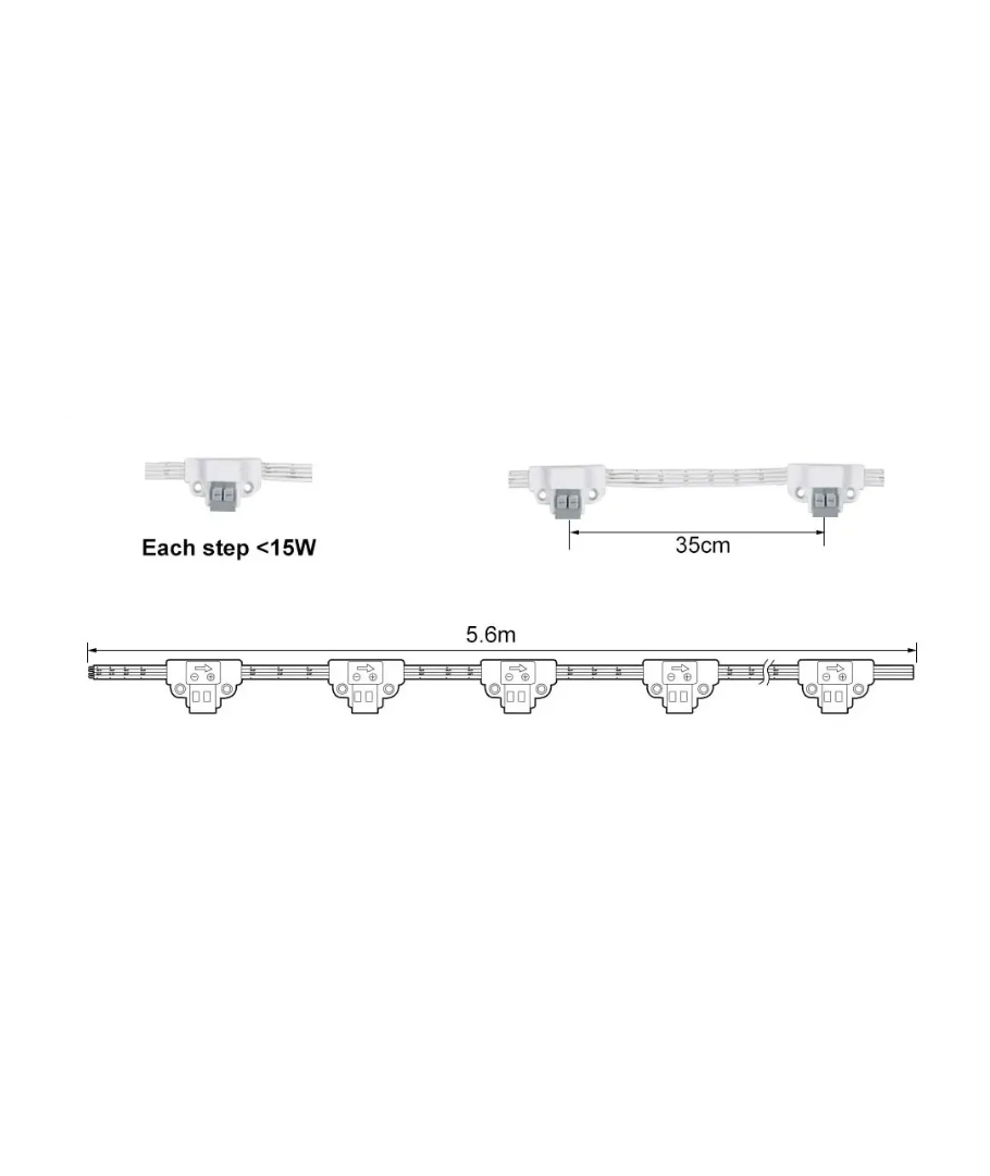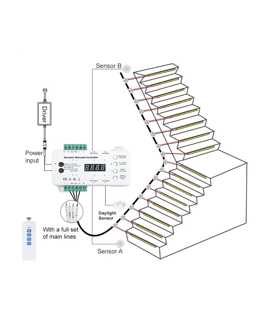 Enkel montering, der det trekkes en "master" ledning på den ene siden av trappen, der lyset til hvert trinn enkelt kobles til. Deretter kan lyset på hvert trinn styres separat med kontrollen.