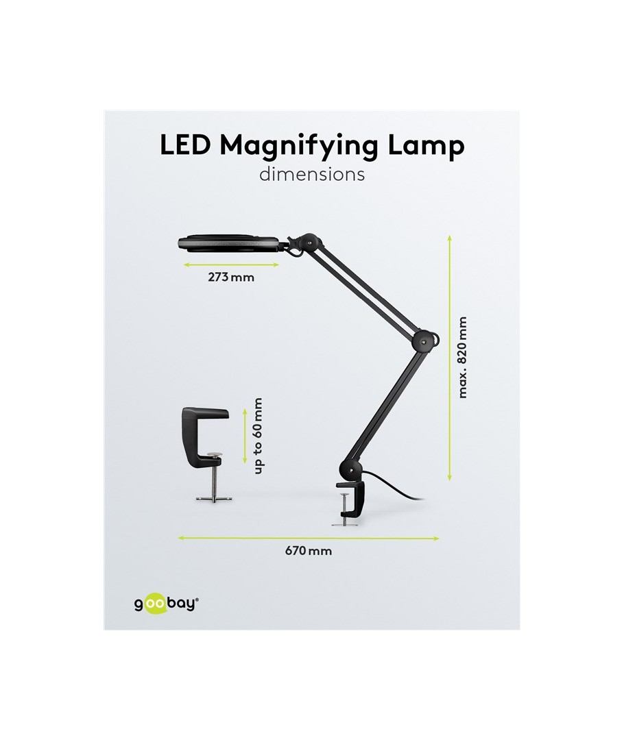 Med dimensjoner på 820 x Ø210 mm, er lampen kompakt nok til ikke å oppta unødvendig arbeidsplass, samtidig som den gir nødvendig belysning og forstørrelse. Den er utstyrt med en klemmefestemekanisme som enkelt kan festes på ulike overflater, noe som øker funksjonaliteten uten å ta opp verdifull arbeidsplass.
