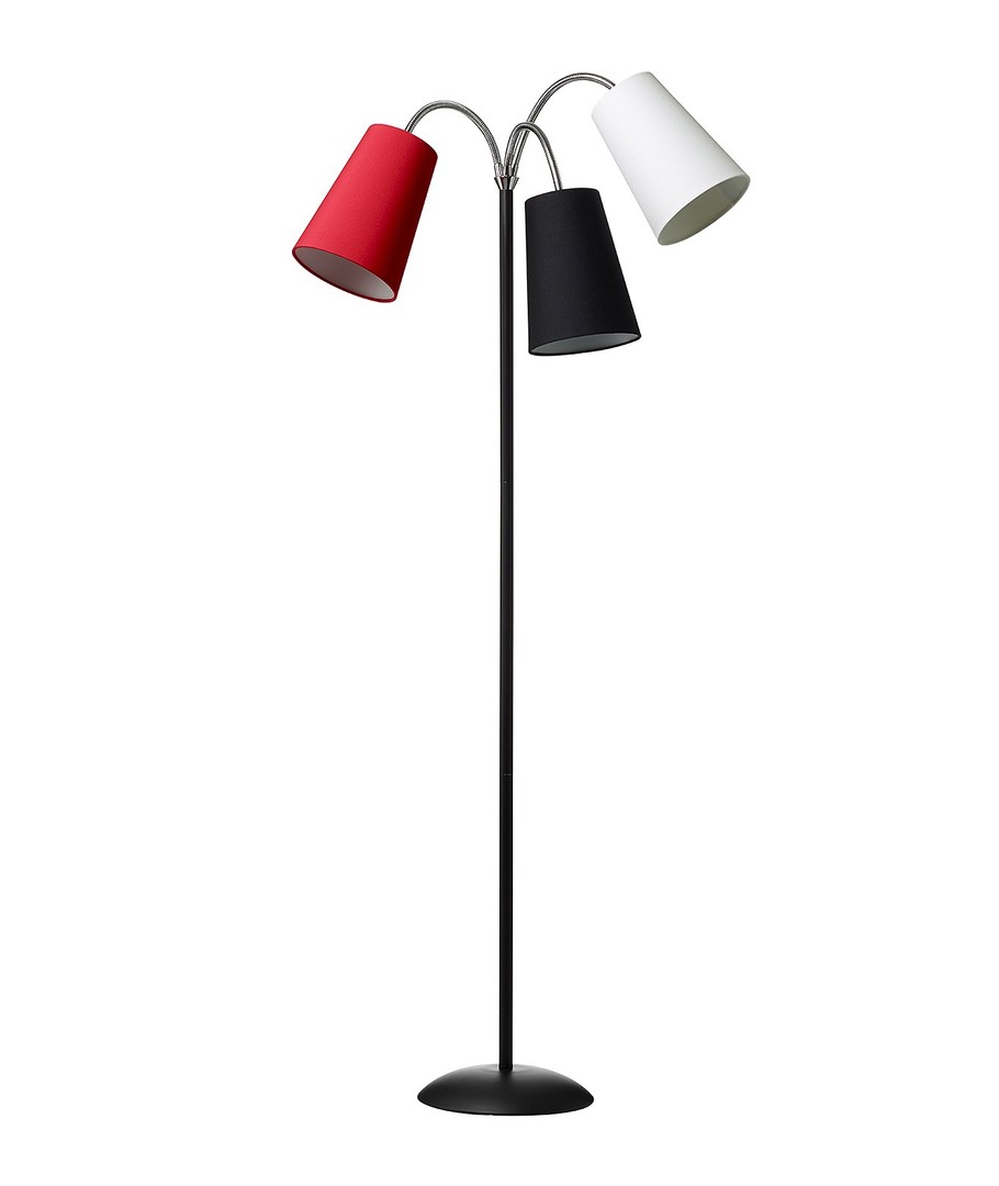 Salsa Gulvlampe fra danske Nielsen Light har svart fot og tre stoffskjermer i fargene svart, hvit og rød.