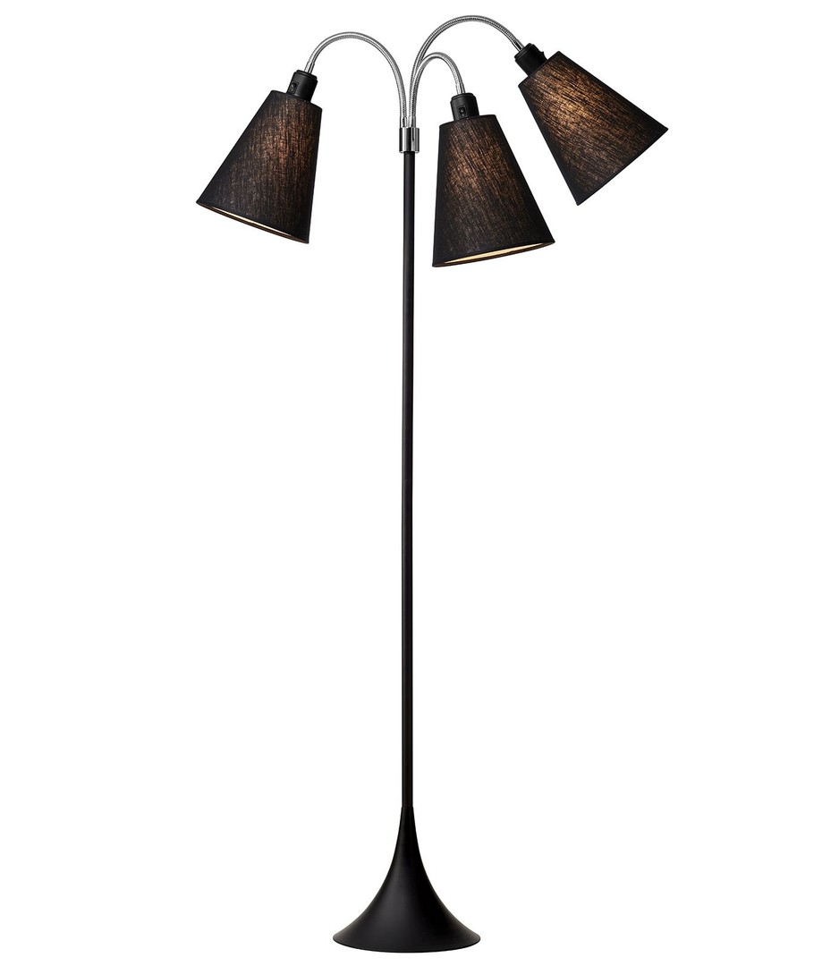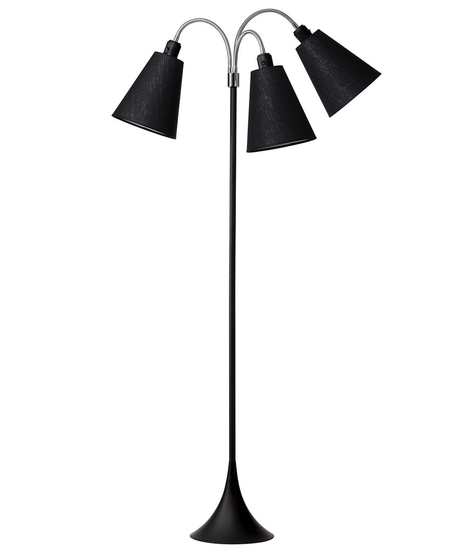 En helt svart gulvlampe med en form som er både funksjonell å bruke og elegant å se på.