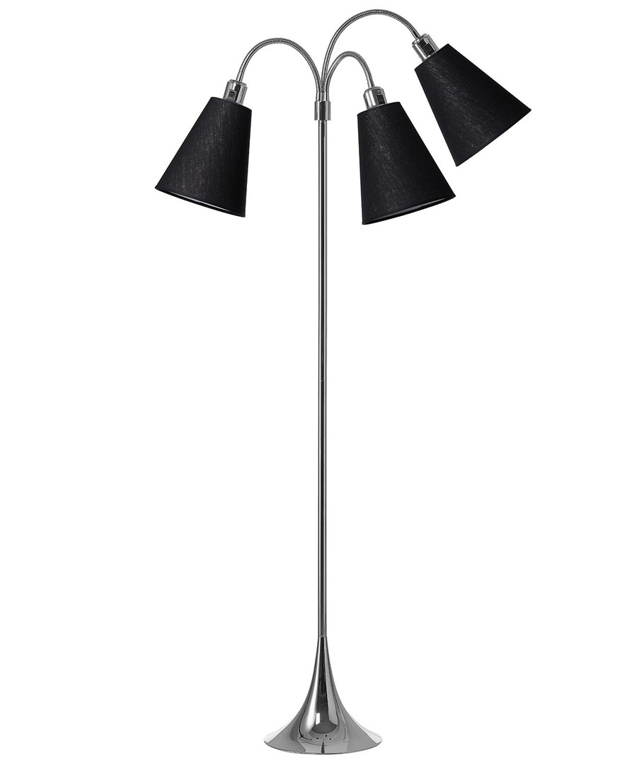Den klassiske, funksjonelle gulvlampen i elegant design, med kromatisk stamme og 3 skjermer i sort.