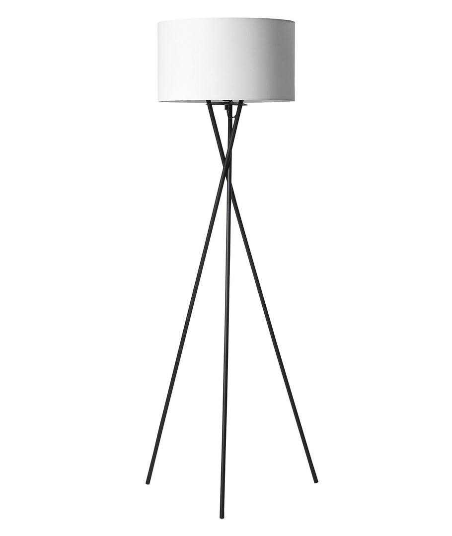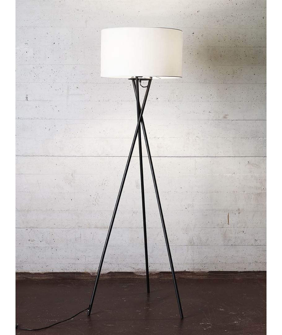 Uptown Gulvlampe fra Nielsen Light, med metall tripod-stativ og stoffskjerm. De 3 bena er utført i glatt metall, hvor ledningen er skjult i det ene benet. Det gir lampen et flott stilrent utseende, og den store stoffskjermen er prikken over i'en. Det er E27 fatning til maks 60 watt halogenpære eller maks 10 watt LED. Det er montert gulvbryter på ledningen.