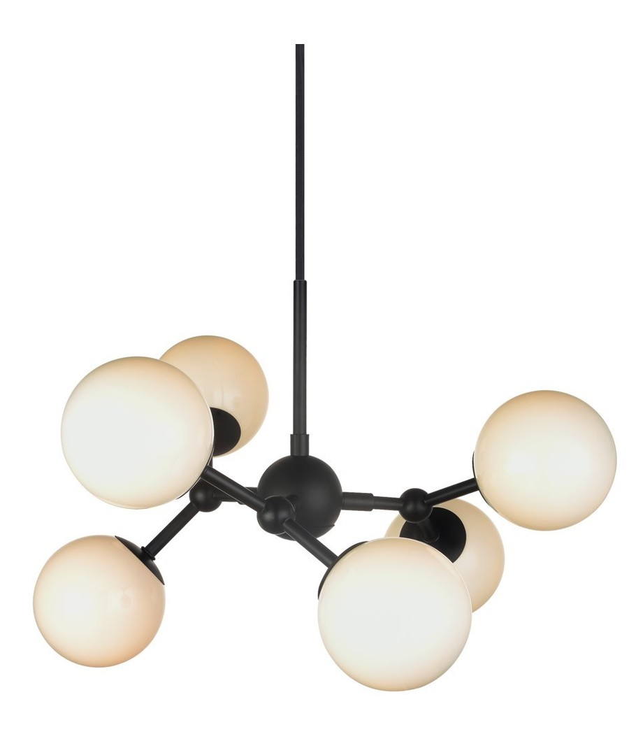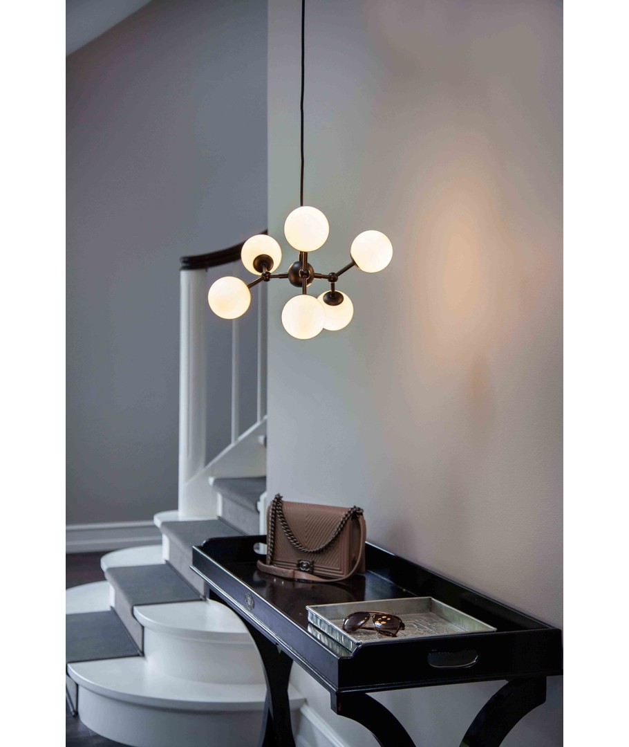 Design og MaterialvalgLysekronen kombinerer et sofistikert sort metallskjelett med delikate opale glasskjermer, og skaper en iøynefallende kontrast som passer inn i både moderne og klassiske interiør. De seks lyspunktene gir muligheten for en balansert lysfordeling i rommet.