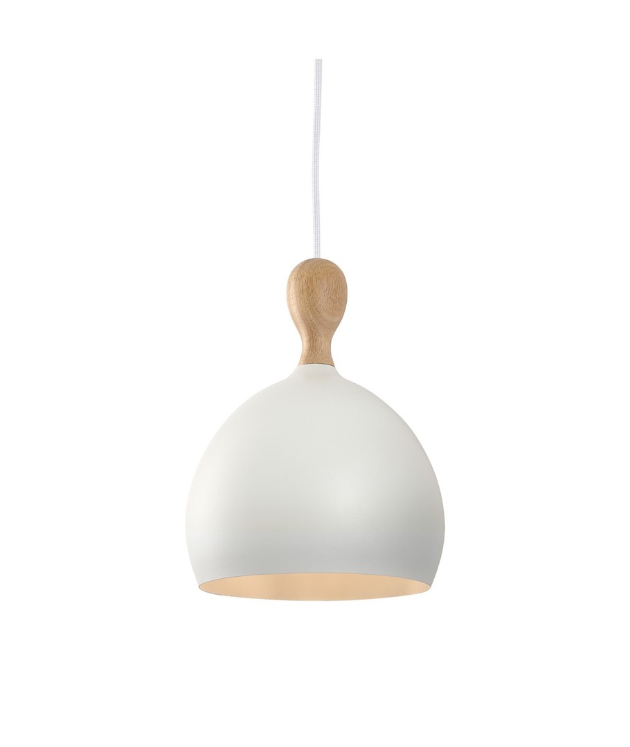 Pendelen er laget av hvit metall kombinert med tre, som gir et naturlig og minimalistisk uttrykk. Den stilrene formen og den rene fargen passer godt inn i ulike interiørstiler, enten det er skandinavisk, moderne, eller klassisk.