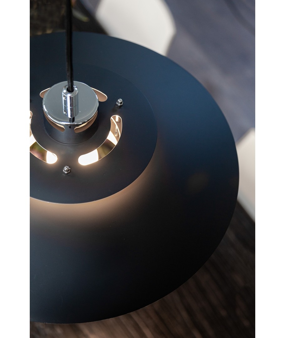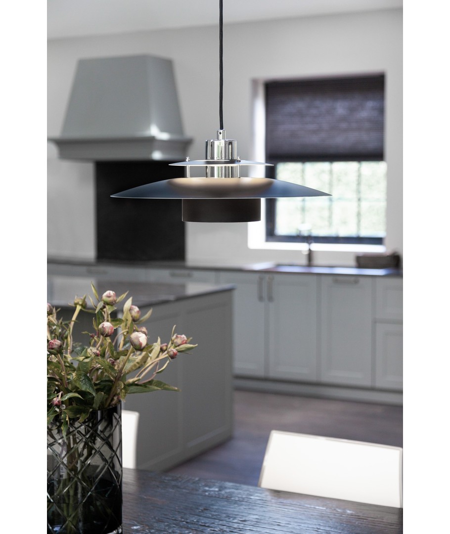 Den slanke og polerte overflaten kombinerer sort og krom i en elegant harmoni, noe som gjør pendelen til et blikkfang uten å virke dominerende. Diameteren på 40 mm gjør lampen ideell for et bredt spekter av rom, fra spisestuer og stuer til soverom og ganger.