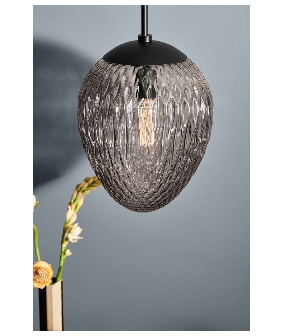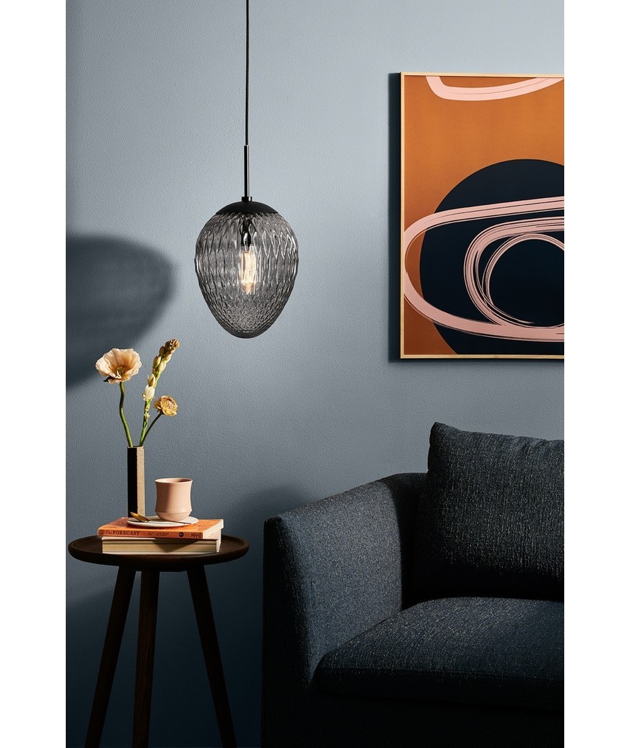WOODS pendelens unike design i røykfarget glass gir en behagelig og myk lysfordeling, samtidig som den skaper en varm og innbydende atmosfære. Den har en kompakt størrelse med dimensjoner på 43 x Ø25 mm, som gjør den perfekt til de fleste rom, enten det er over spisebordet, på kjøkkenet eller i stuen.