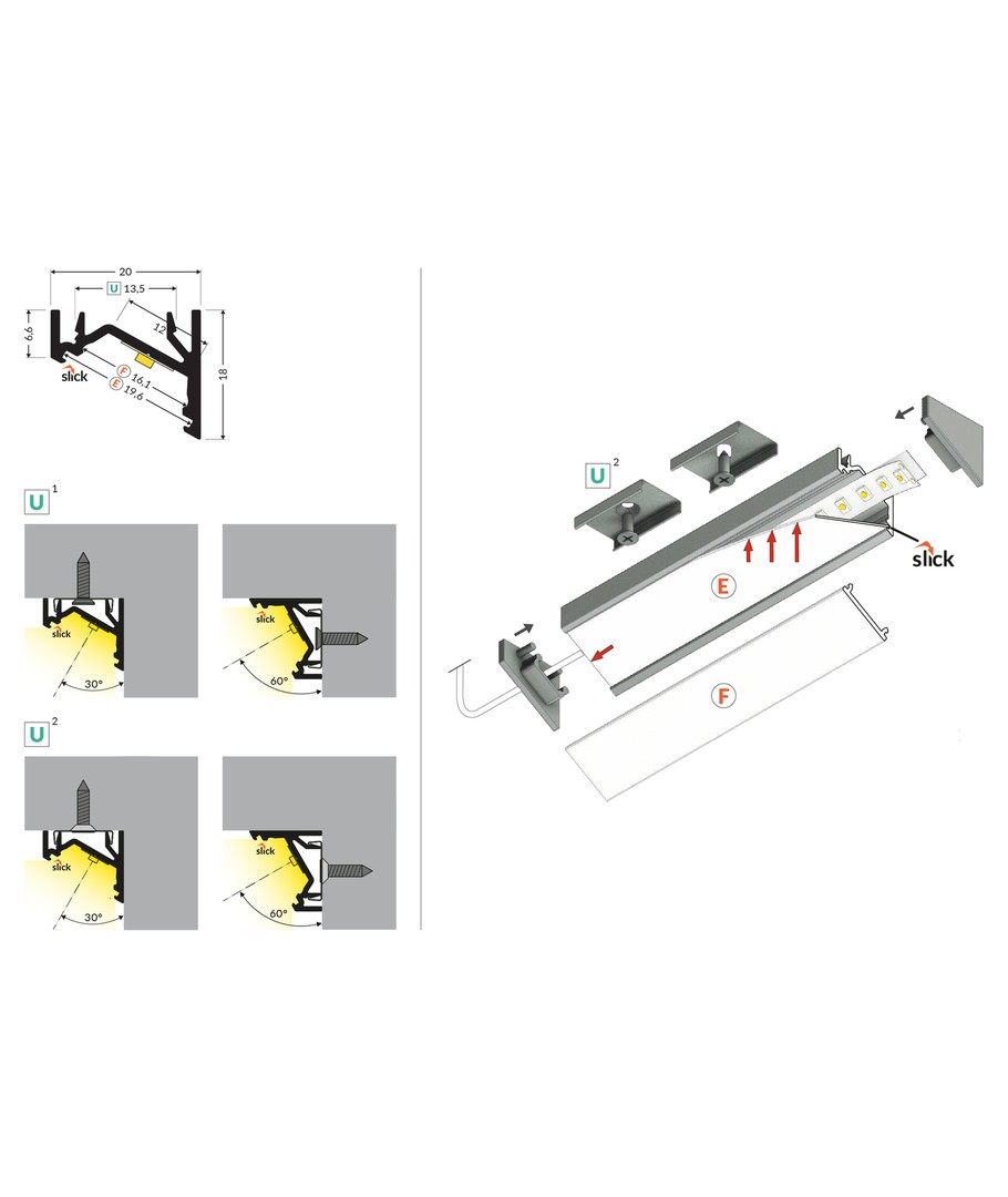 Ubehandlet aluminium, hjørne, LED skinne