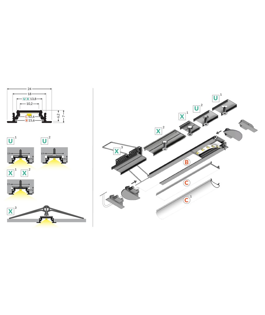 Ubehandlet aluminium, innebygd, LED-skinne