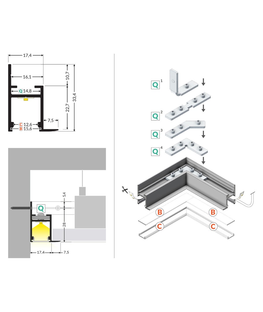 Ubehandlet aluminium, innfelling, LED-skinne