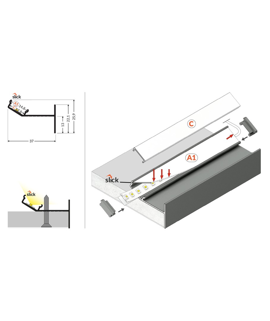 Ubehandlet aluminium, innsparkling, LED-skinne