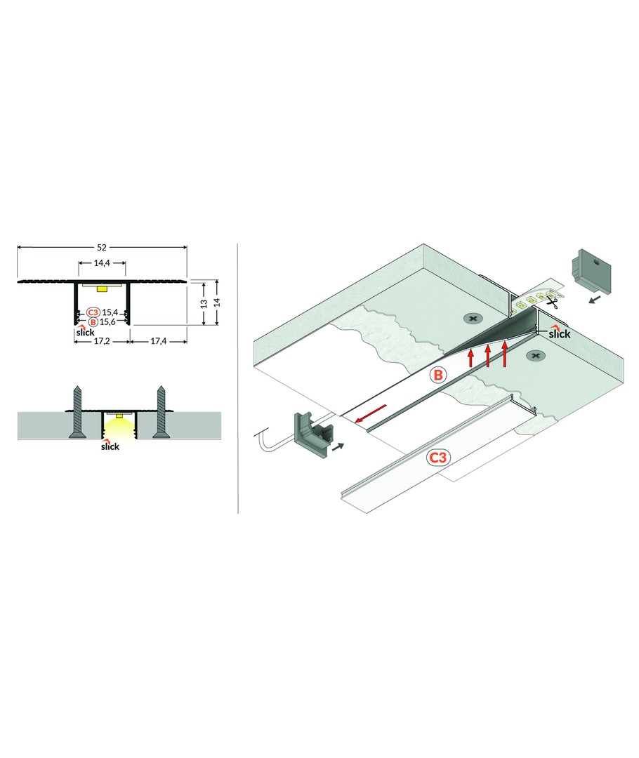 Ubehandlet aluminium, innfelling, LED-skinne