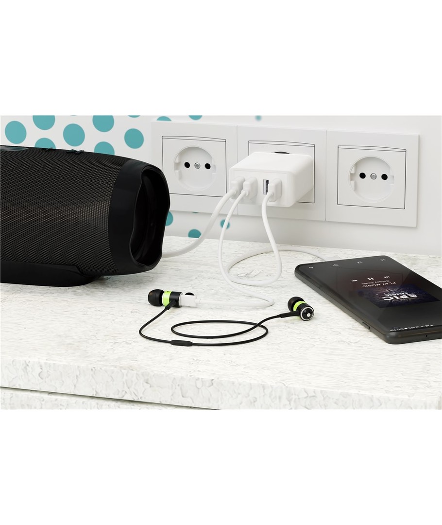 Med ikke mindre enn 4 kraftige USB-A porter, gir denne laderen deg muligheten til å lade opptil 4 enheter samtidig. Slutt på bryderiet med å velge mellom gadgetene dine - nå kan du lade dem alle samtidig!