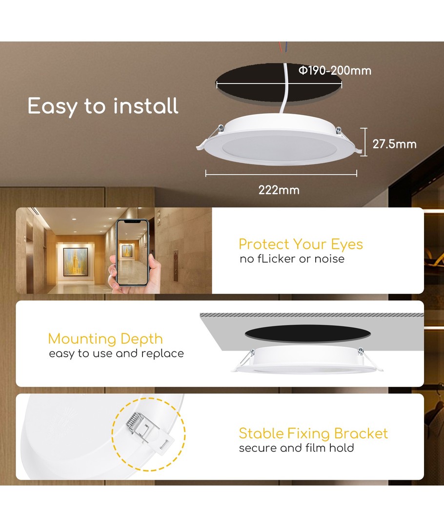 Med kompakte dimensjoner på 27.5 x Ø222 mm og en utsparing på 200 mm, er denne spotten designet for enkel, innfelt montering. Den runde utformingen og den plane monteringen bidrar til en diskret installasjon som glir sømløst inn i ethvert tak.