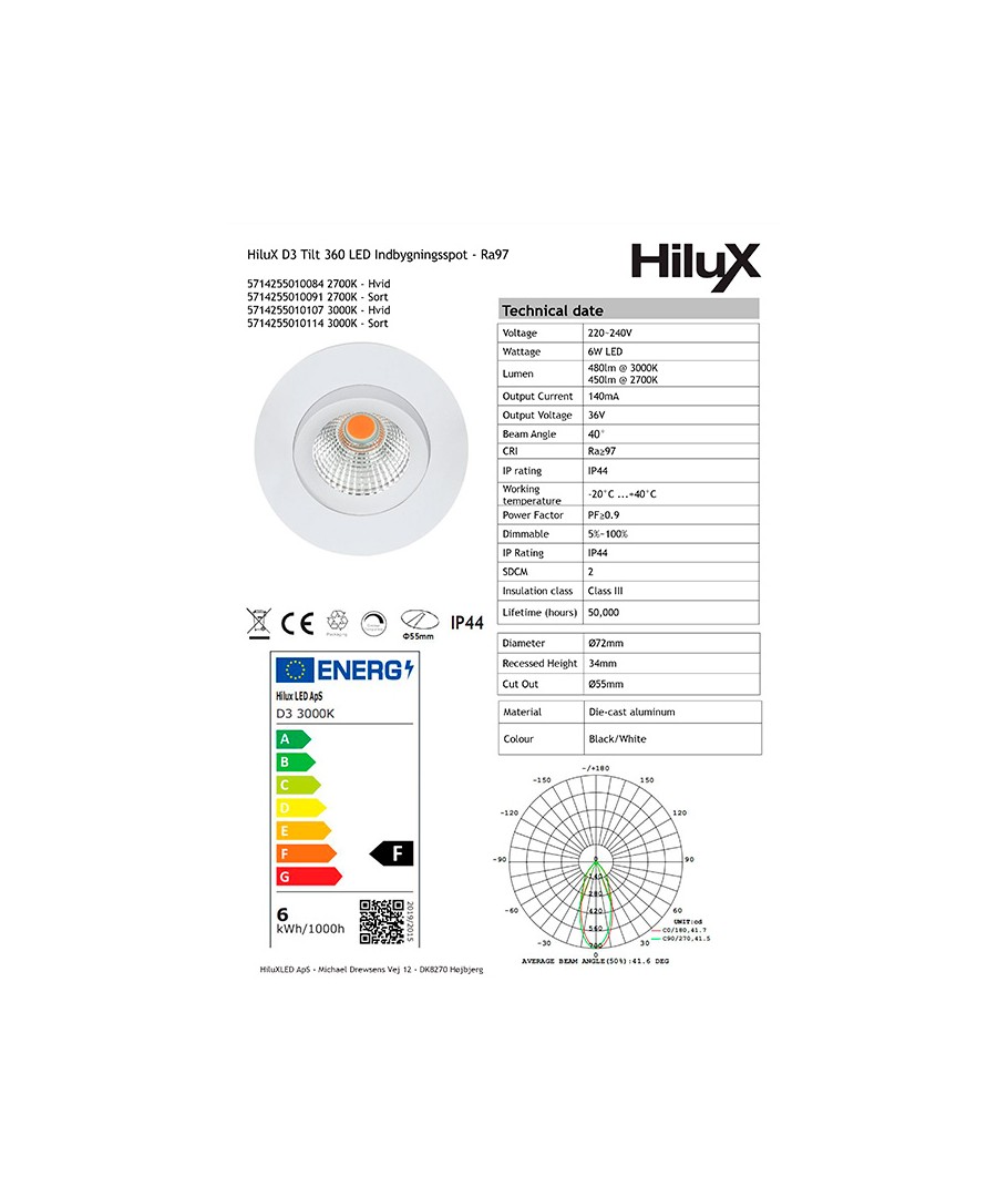 Fleksibel plassering: Med IP44-klassifisering er HiluX D3 Tilt360 beskyttet mot inntrenging av støv og vann, noe som gjør den egnet for installasjon både innendørs, utendørs og i våtrom.