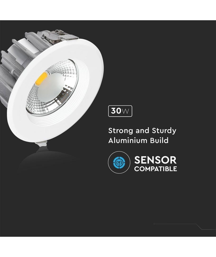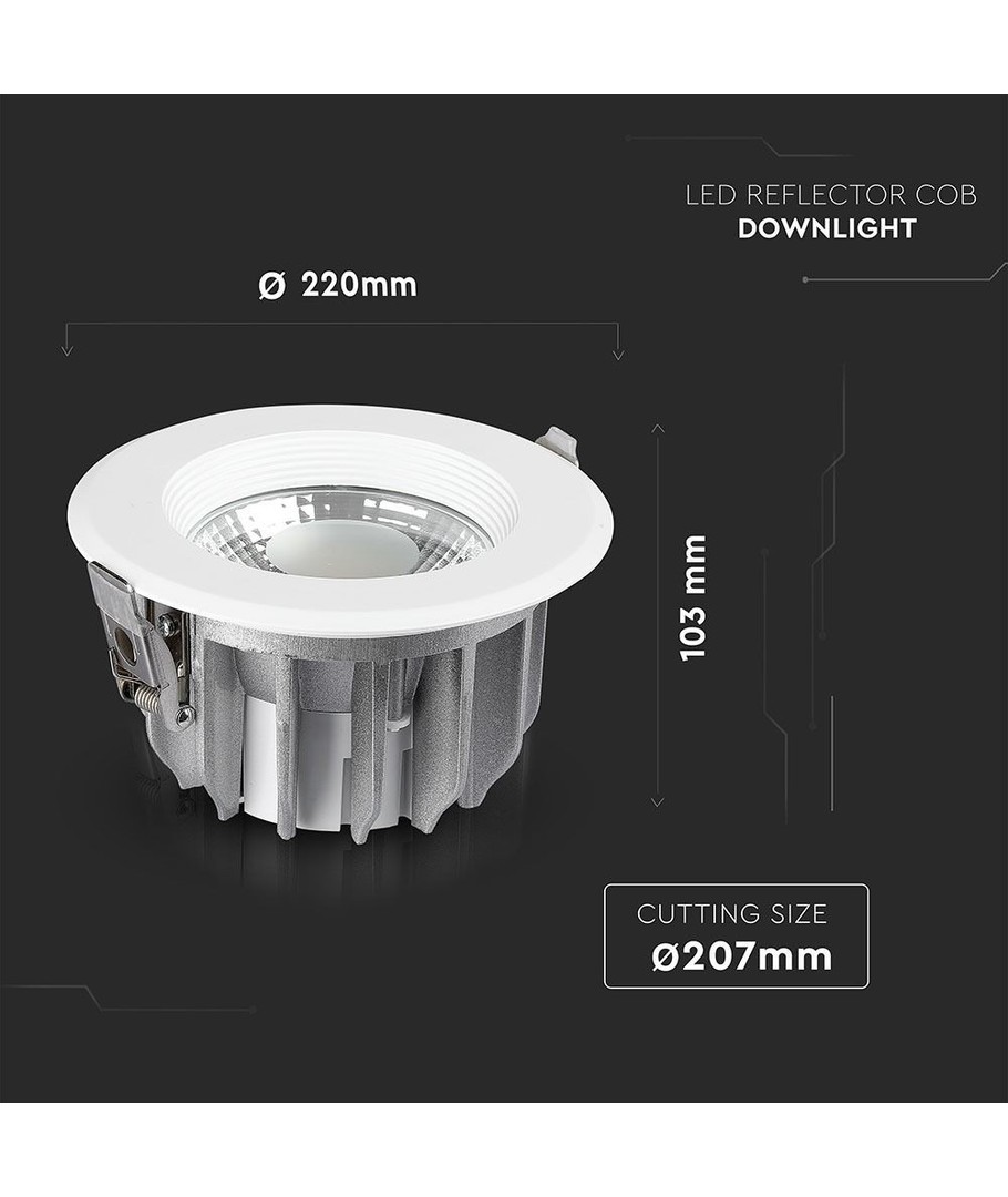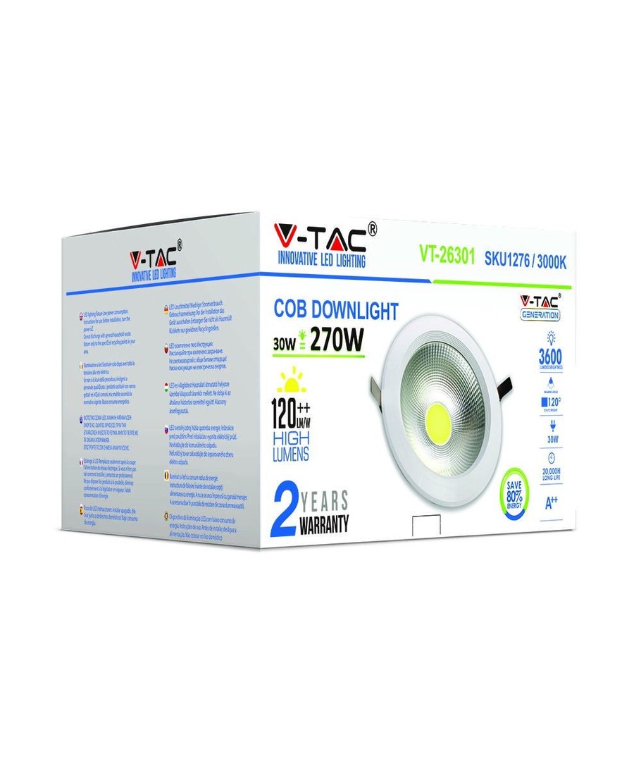 Opplev en kraftig og energieffektiv belysning med vår V-Tac 30W LED downlight. Denne lampen er perfekt for innbygging og erstatter tradisjonelle 270W lyskilder, noe som gjør den til et miljøvennlig valg for ethvert moderne hjem eller arbeidsplass.