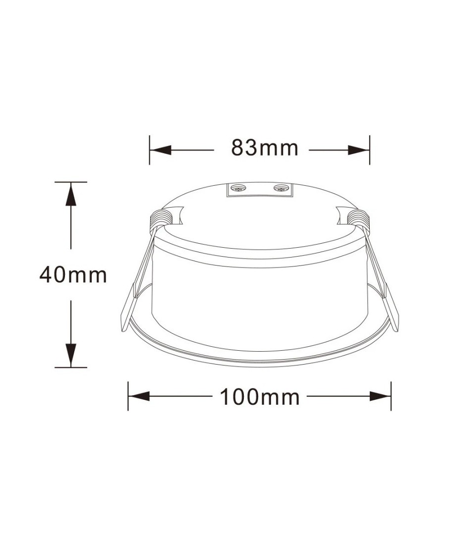 Spottens kompakte design med dimensjoner på 40 x Ø100 mm gjør den lett å installere i ulike taktyper, mens den nødvendige hulstørrelsen på 83 mm tillater en enkel tilpasning.