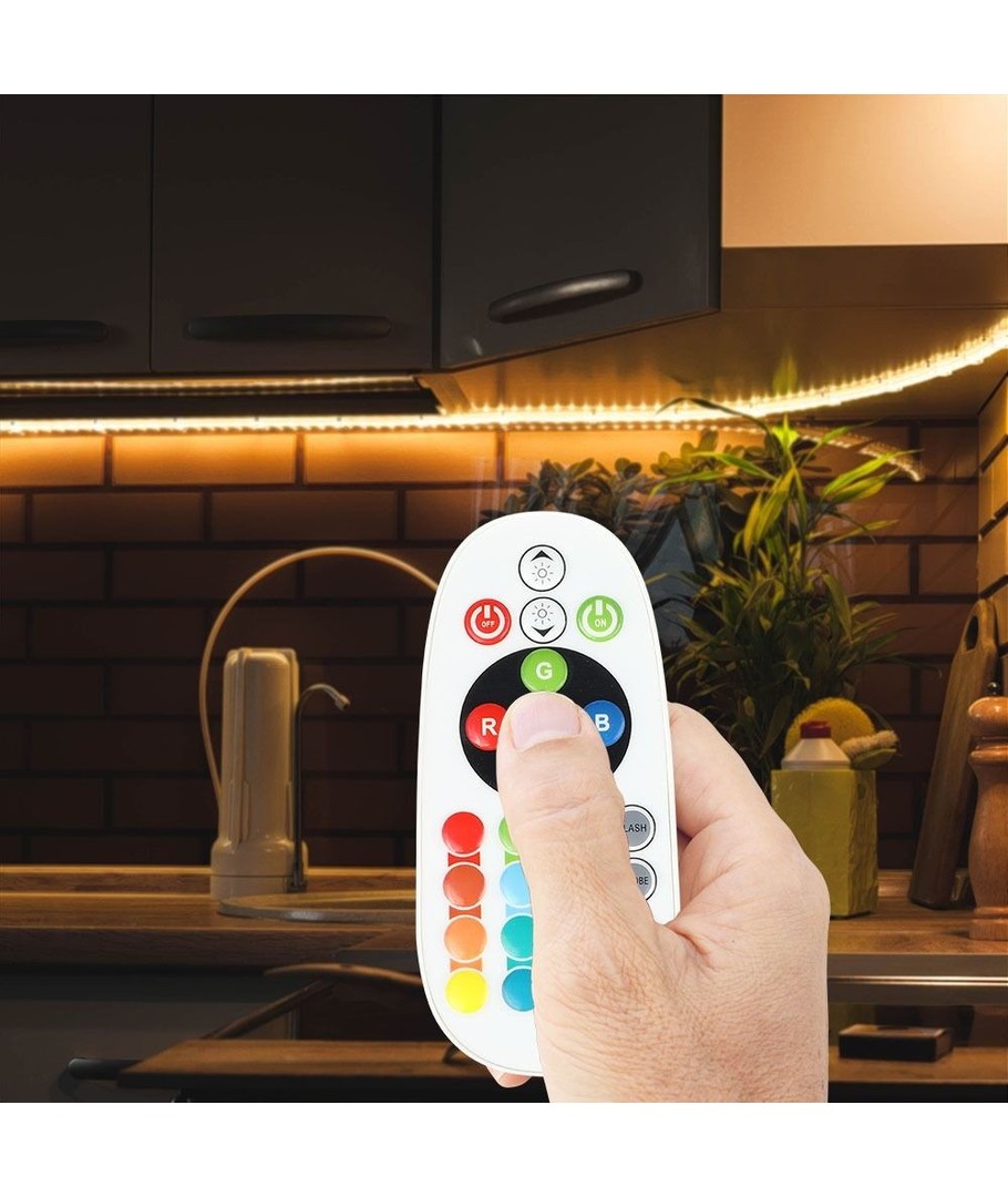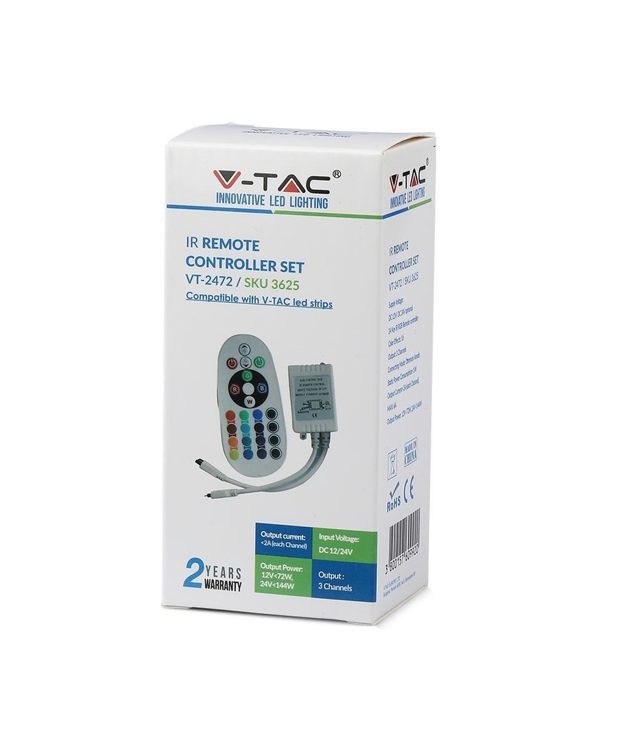 Leveres med fjernkontroll med 24 knapper.