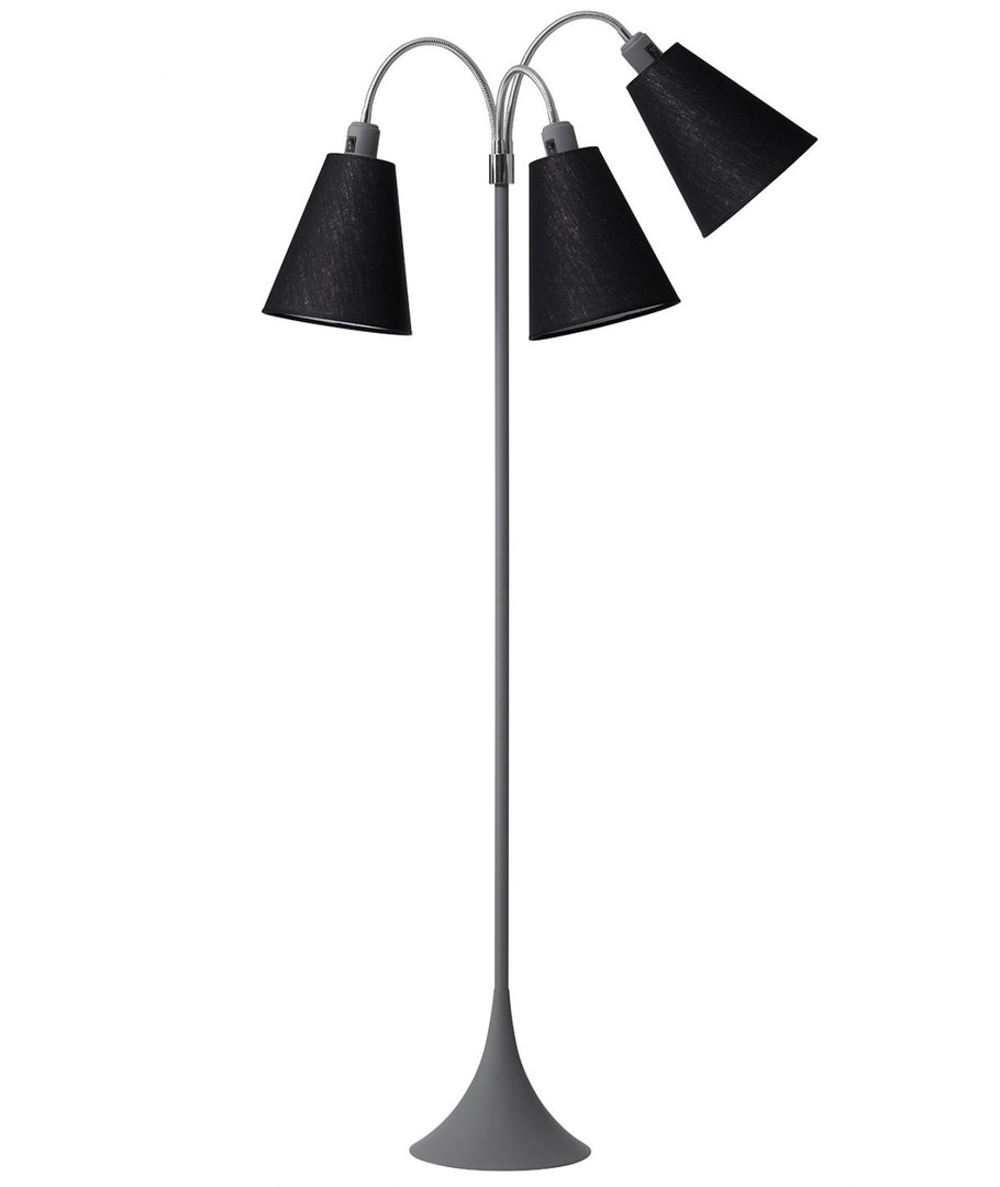 Gulvlampe fra Nielsen Light med 3 fleksible halser i krom, som gjør den lett anvendelig til lesing og andre ting.