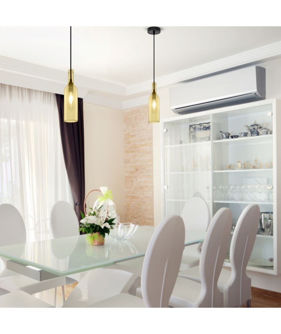 Lampeskjermen har en vakker ravfarget tone som tilfører varme og eleganse til rommet. Den slanke formen minner om en stilisert flaske og gir et moderne preg som passer ypperlig i minimalistiske innredninger. Lampens dimensjoner er 280 x 72 x 1150 mm, noe som gjør den ideell til å henge over spisebord, kjøkkenøyer eller i inngangspartier for å skape en iøynefallende effekt.