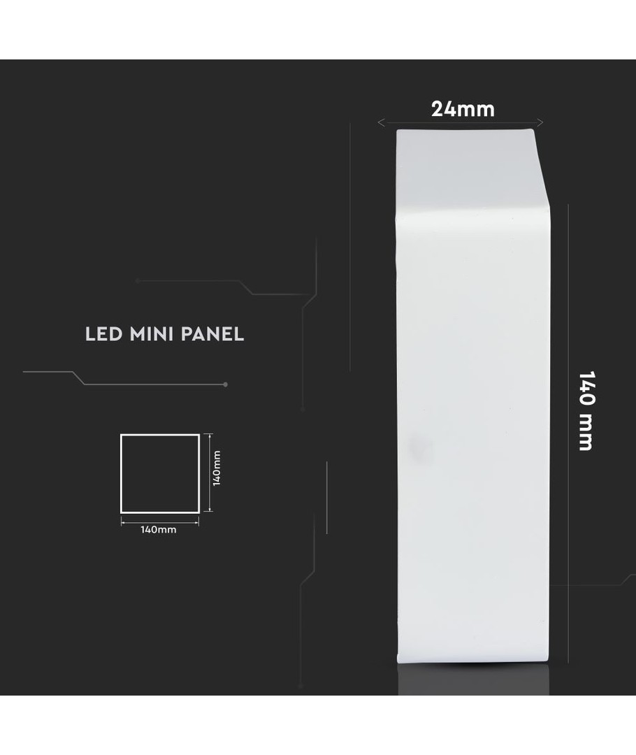 Den har et kompakt design med målene 140 x 24 x 140 mm og en integrert lyskilde.