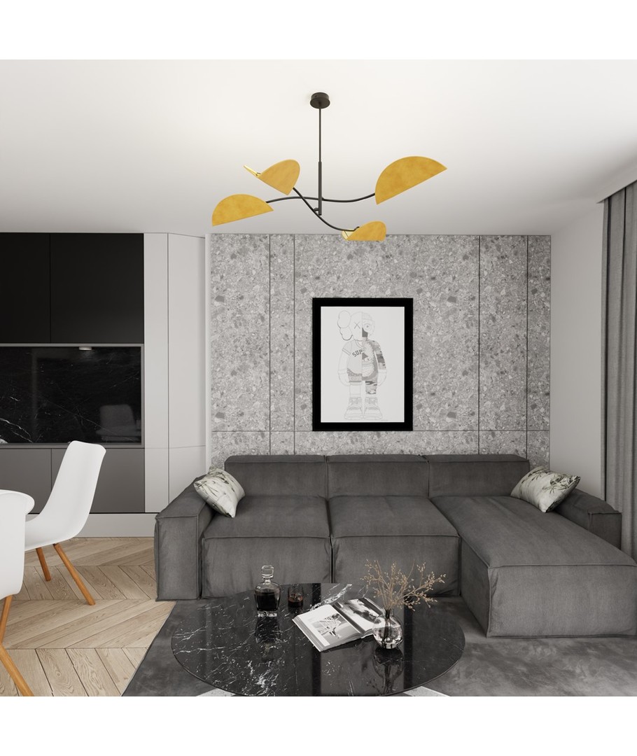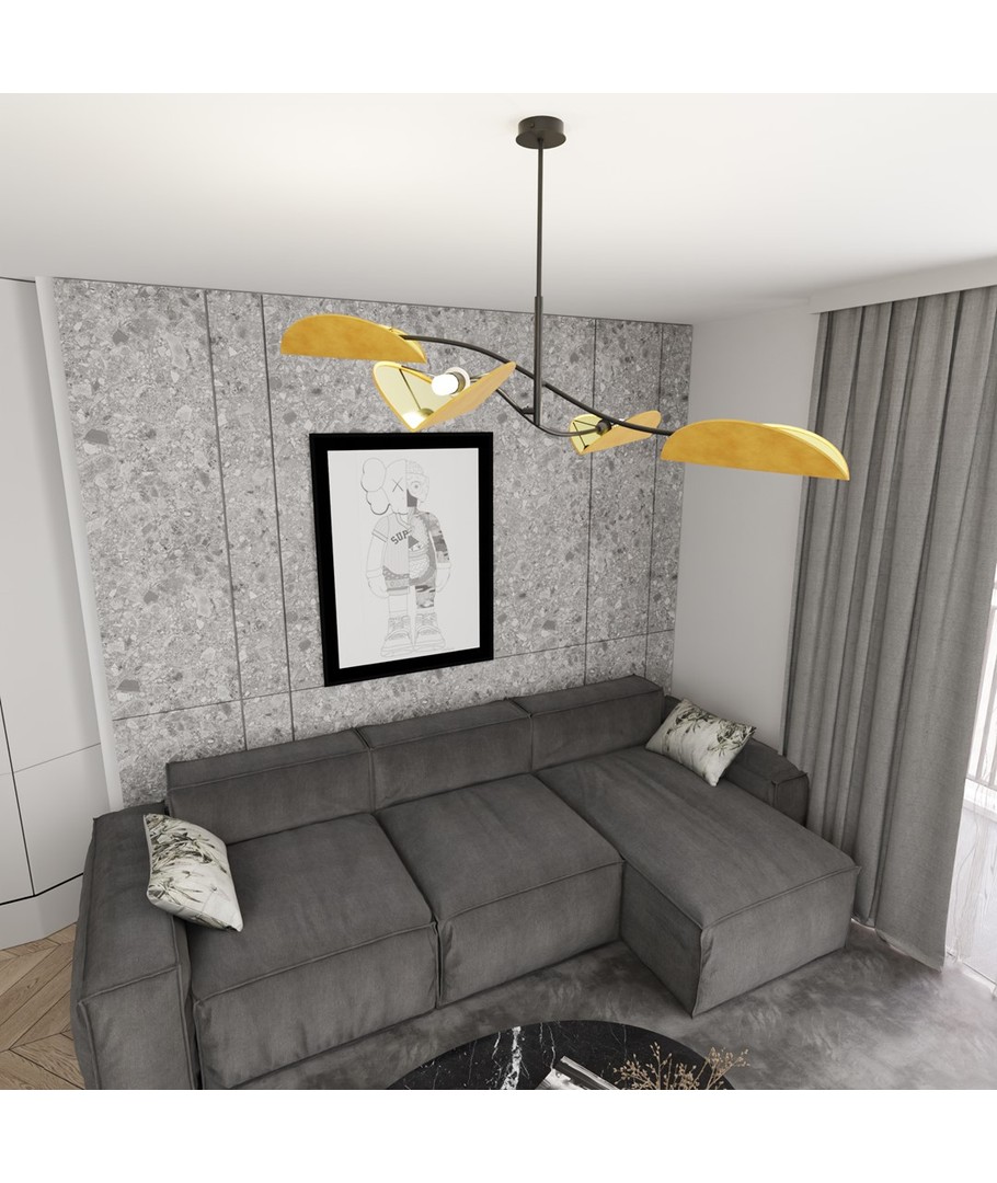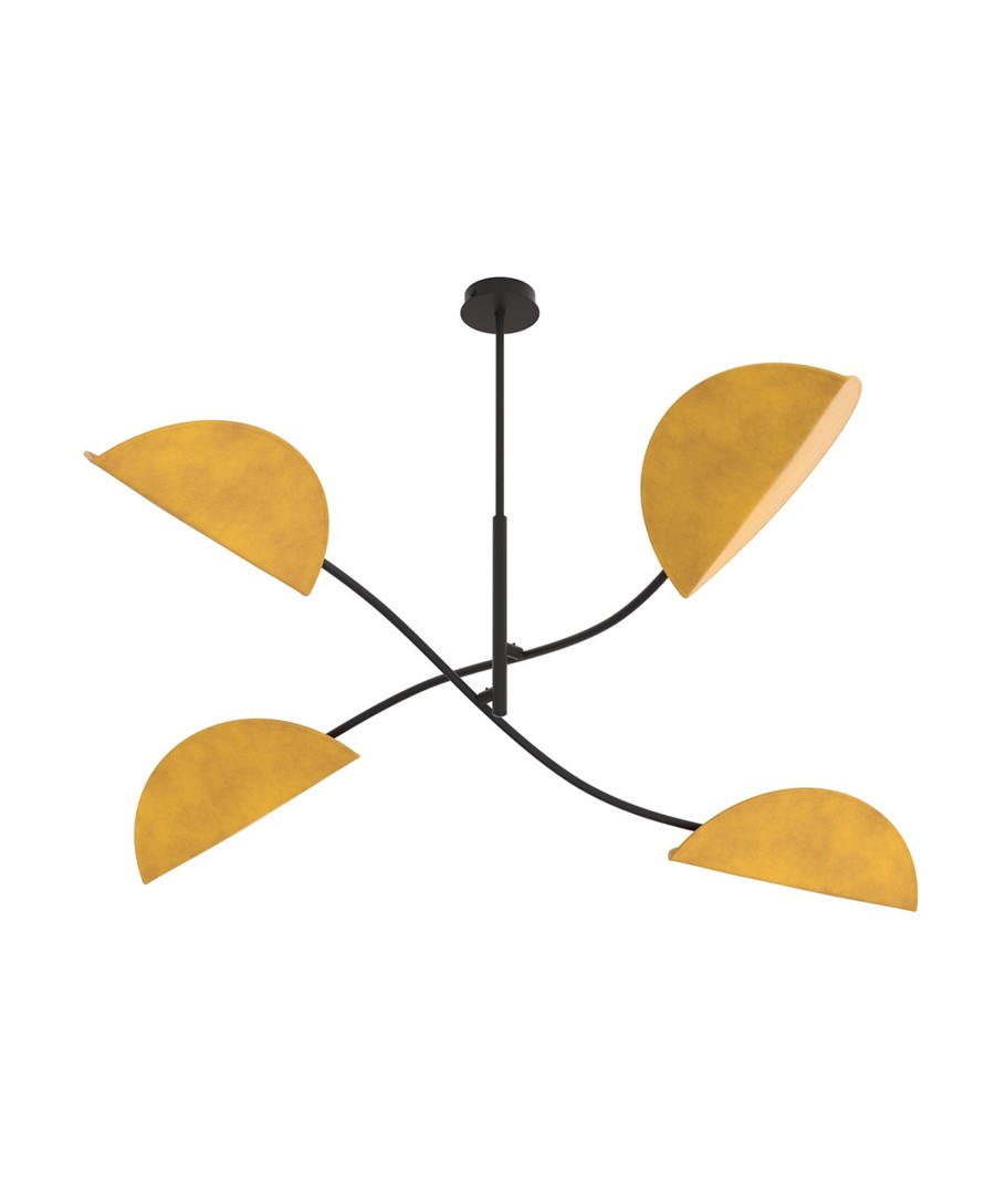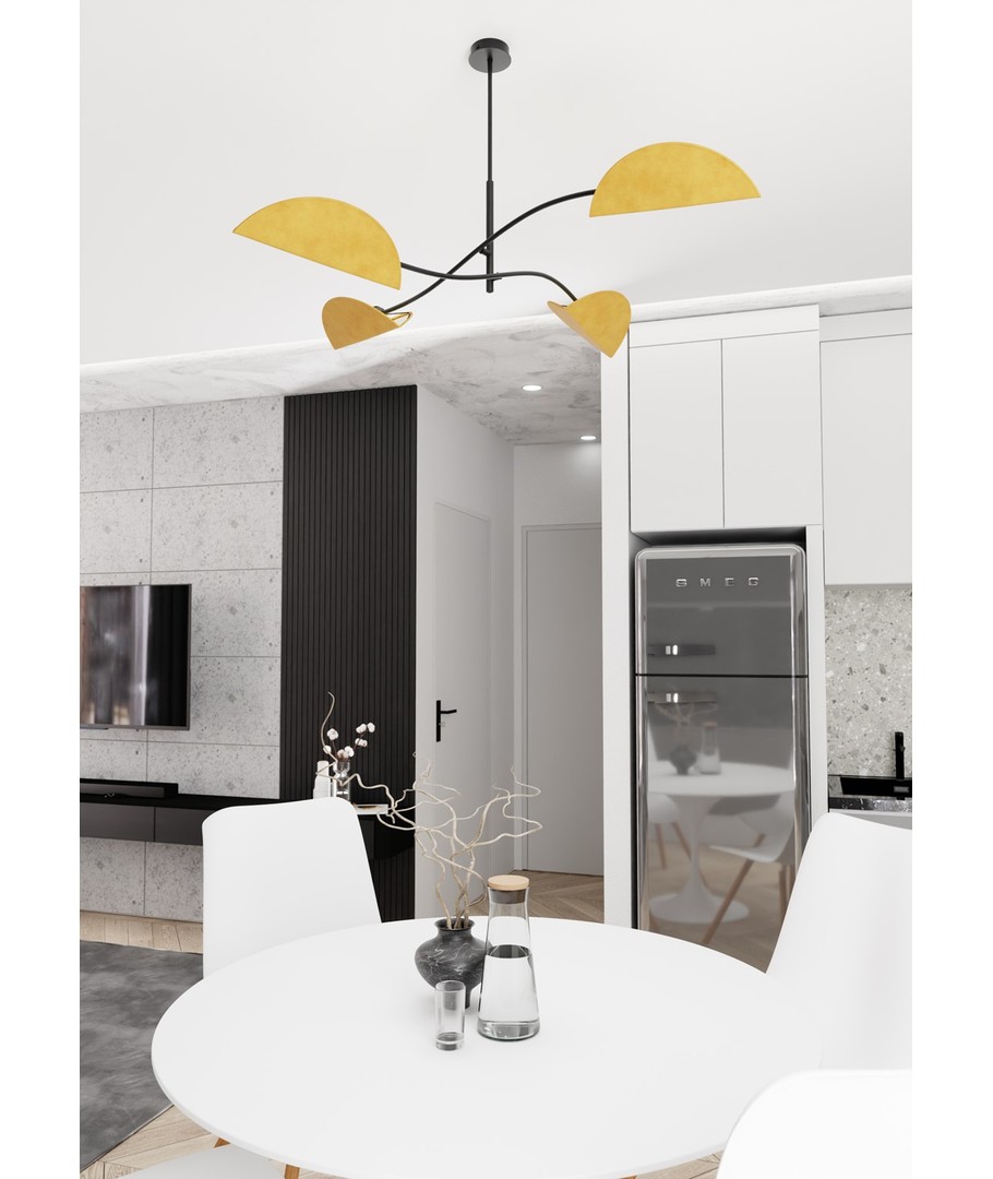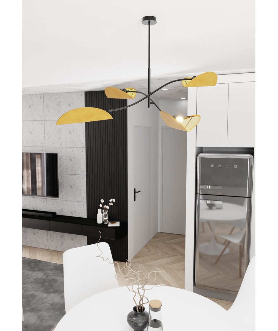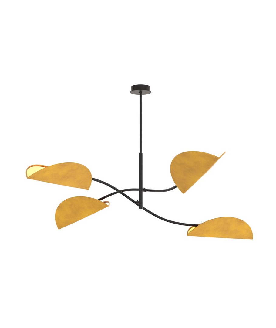 Lotus 4 Sort/Gullig-oransje taklampen er det perfekte valget for dem som verdsetter unike materialer og en original etnisk design. Med sine karakteristiske bladformede skjermer utstråler lampen en enestående delikatesse, som tilfører varme og skaper en koselig atmosfære i rommet. Taklampen er ideell for både stuen og soverommet, hvor den vil tiltrekke seg oppmerksomhet fra enhver besøkende. De åpne skjermene sikrer utmerket belysning som forbedrer rommets spesielle stemning.