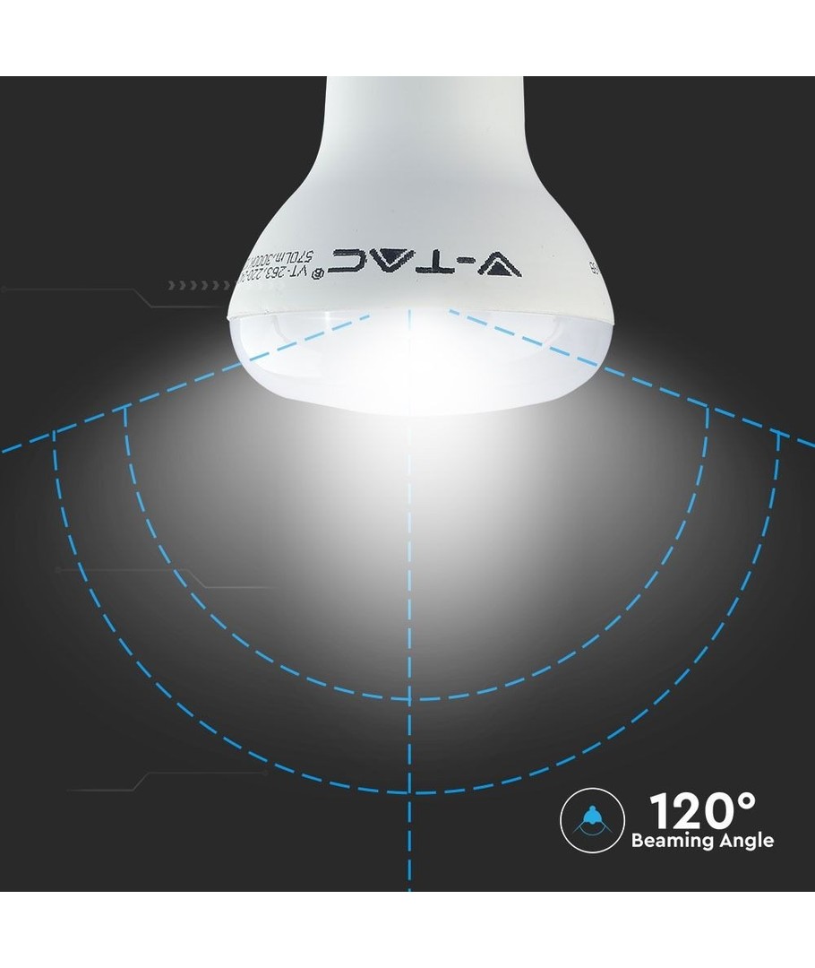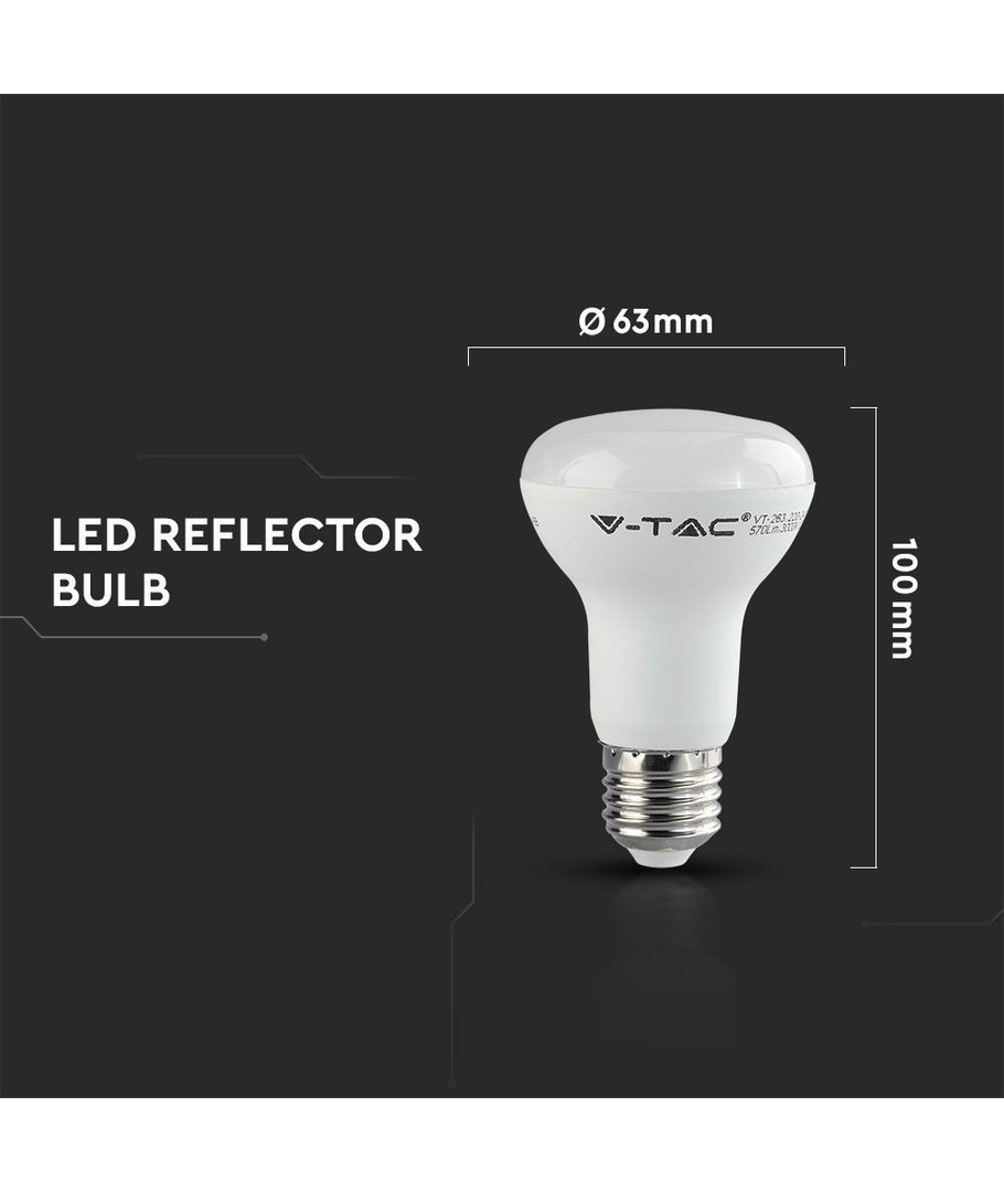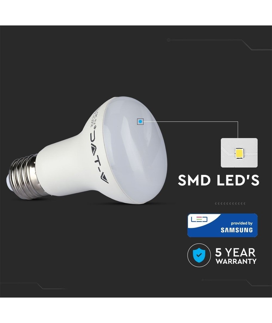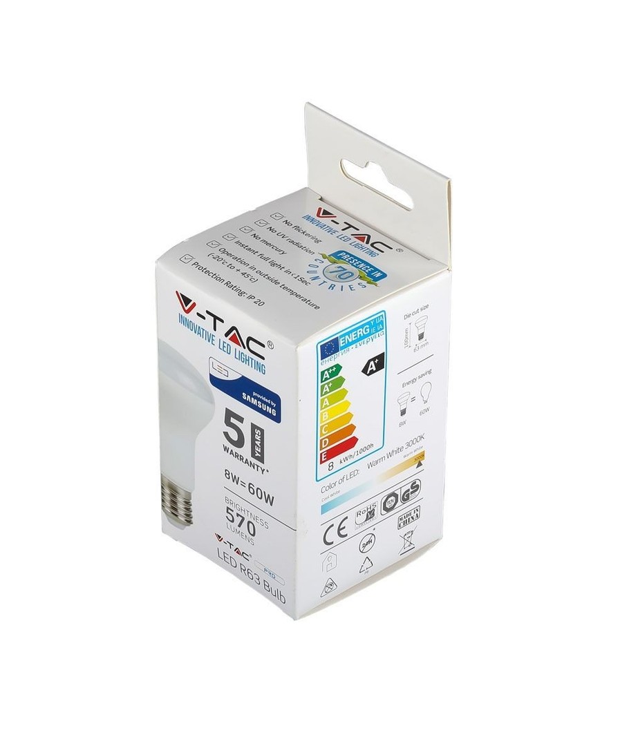 V-Tac 8W LED spotpæren har en E27 stor fatning og kobles enkelt til en 230V forsyning, noe som gjør den lett å installere i de fleste standard lamper og lysfittings.