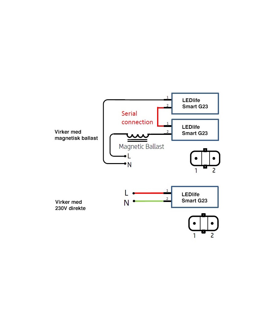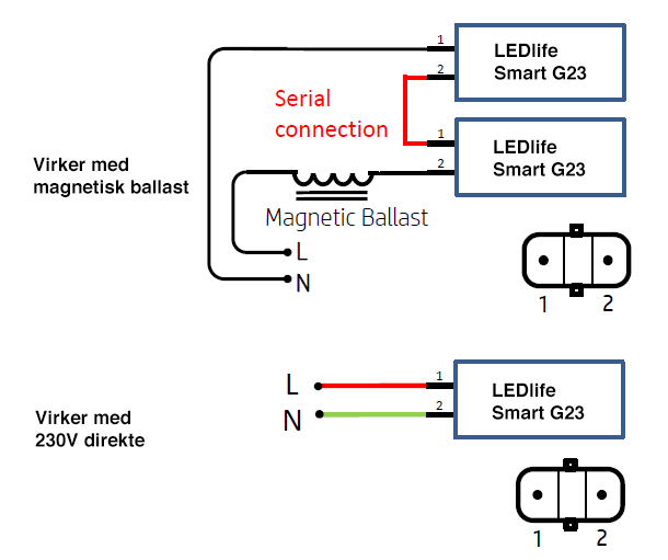 Ballast kompatibel og kan også brukes med 230V direkte.