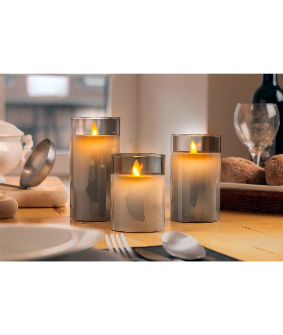 Denne 3-pakningen gjør det enkelt å plassere lysene på ulike steder i hjemmet, enten det er på spisebordet, i vinduskarmen, eller på en hylle for å skape et koselig hjørne. Hver lampe er innkapslet i elegant grått glass, noe som forsterker deres moderne og stilrene utseende, og gir en subtil, men sofistikert berøring til din innredning.