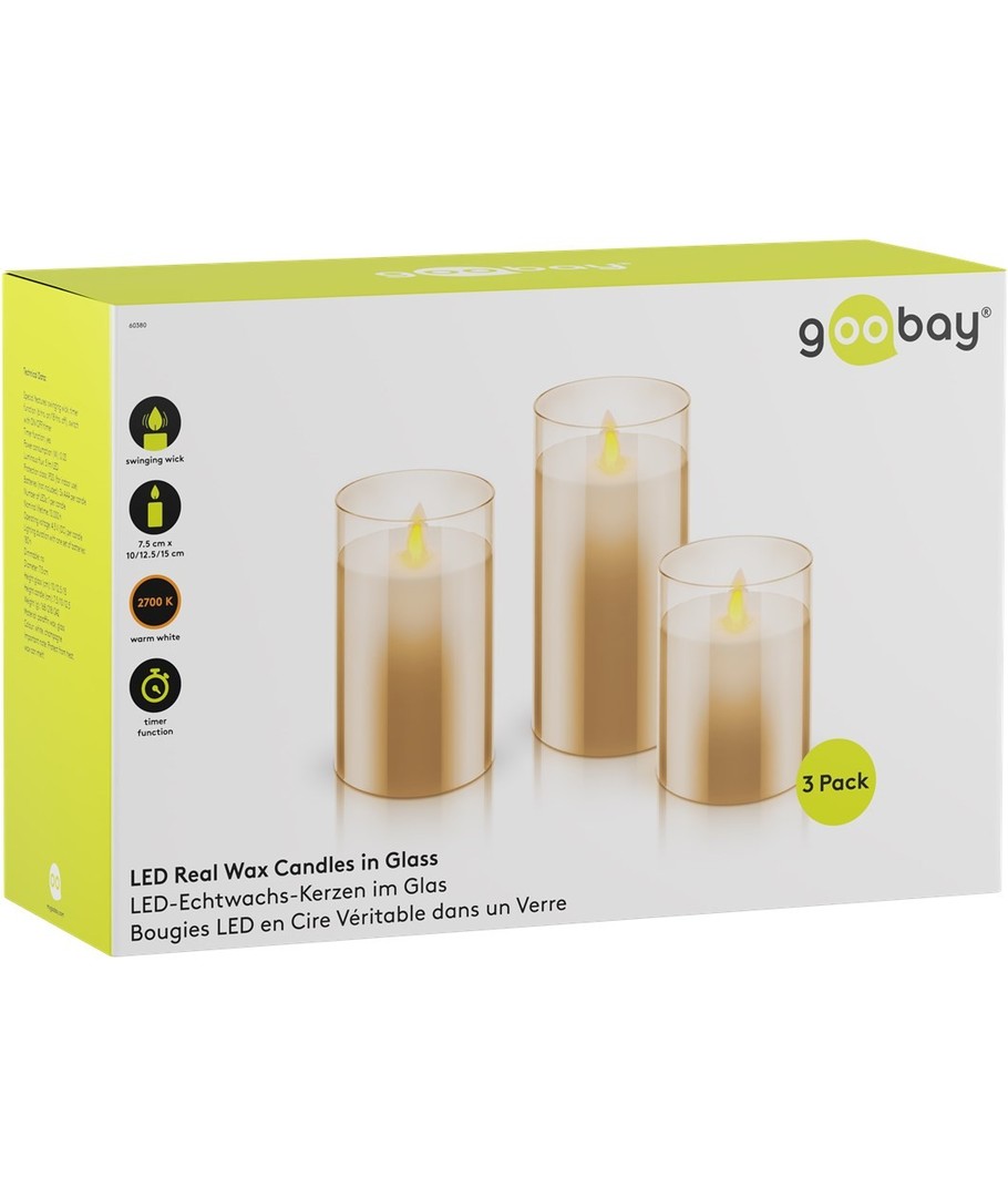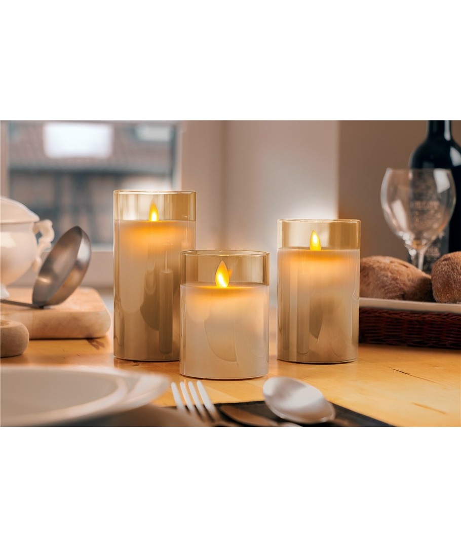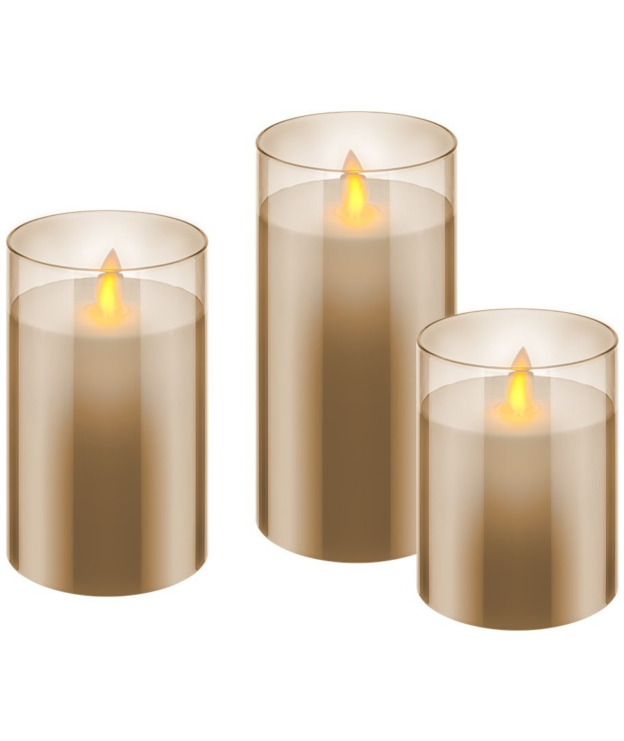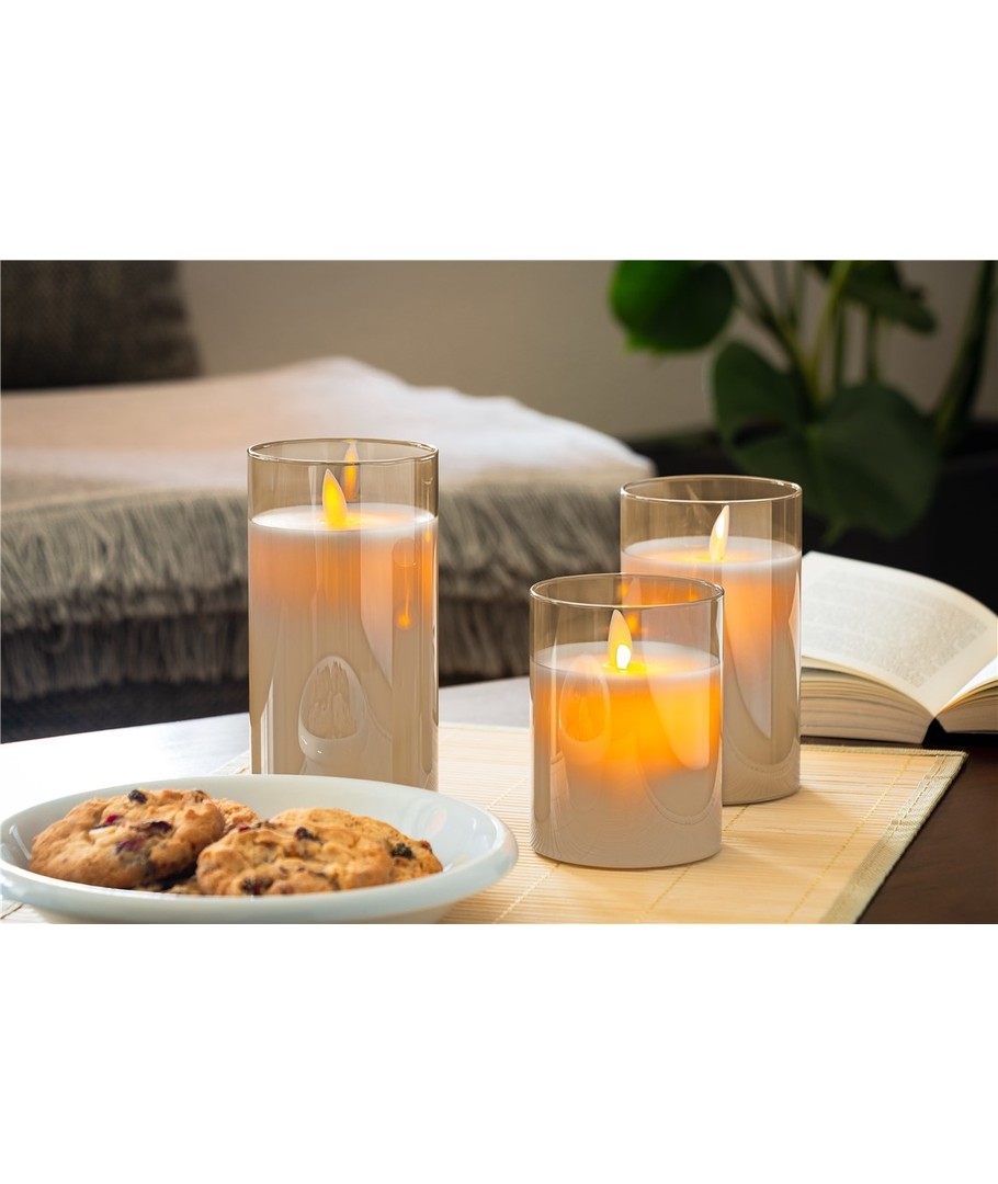 Legg til et innbydende og behagelig lys i ditt hjem med denne elegante 3-pakningen med sandfargede LED vokslys omsluttet i stilfulle glass. Disse lysene er ikke bare vakre å se på, men leverer også en høy lyskvalitet som gir en naturlig glød til rommet ditt.