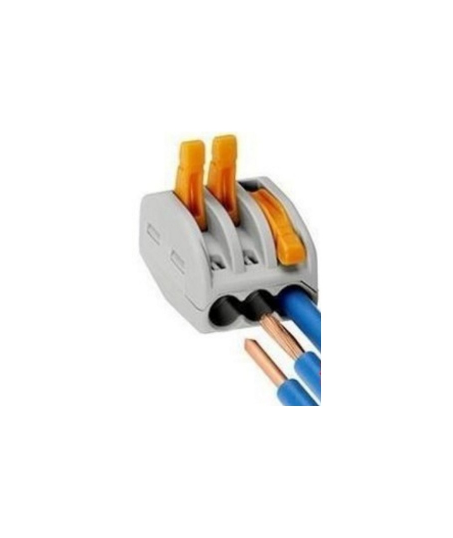 Skrueløs kabelskjøt til 3 ledninger, som kan brukes til både myke og stive ledere samtidig.
