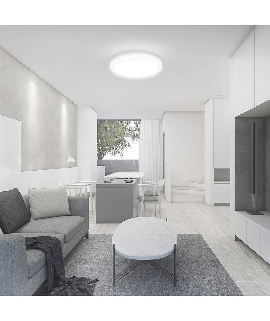Med sitt slanke design, der lampen måler Ø29,5 cm i diameter og har en høyde på 5,5 cm, passer denne taklampen inn i de fleste moderne interiører. Den hvite kanten tilfører et elegant preg.