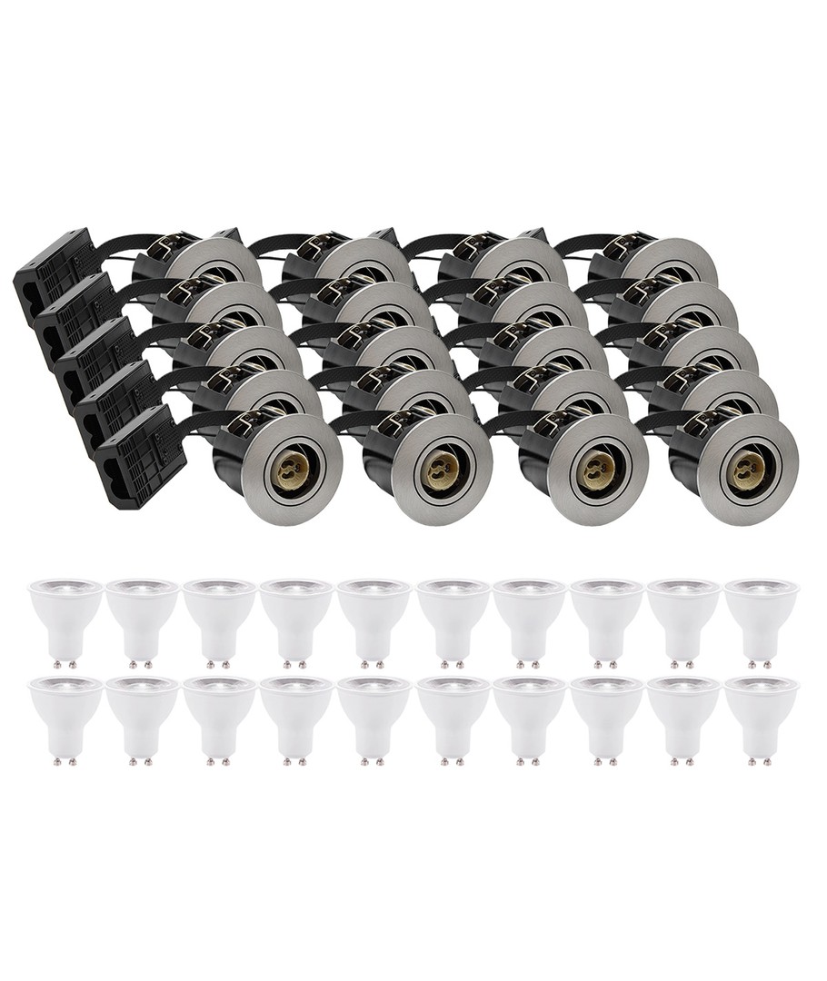 Oppgrader belysningen i ditt hjem med disse stilrene innbyggingsspottene i børstet aluminium. Pakken inneholder 20 stk. og gir deg muligheten til å skape den perfekte lyssettingen.