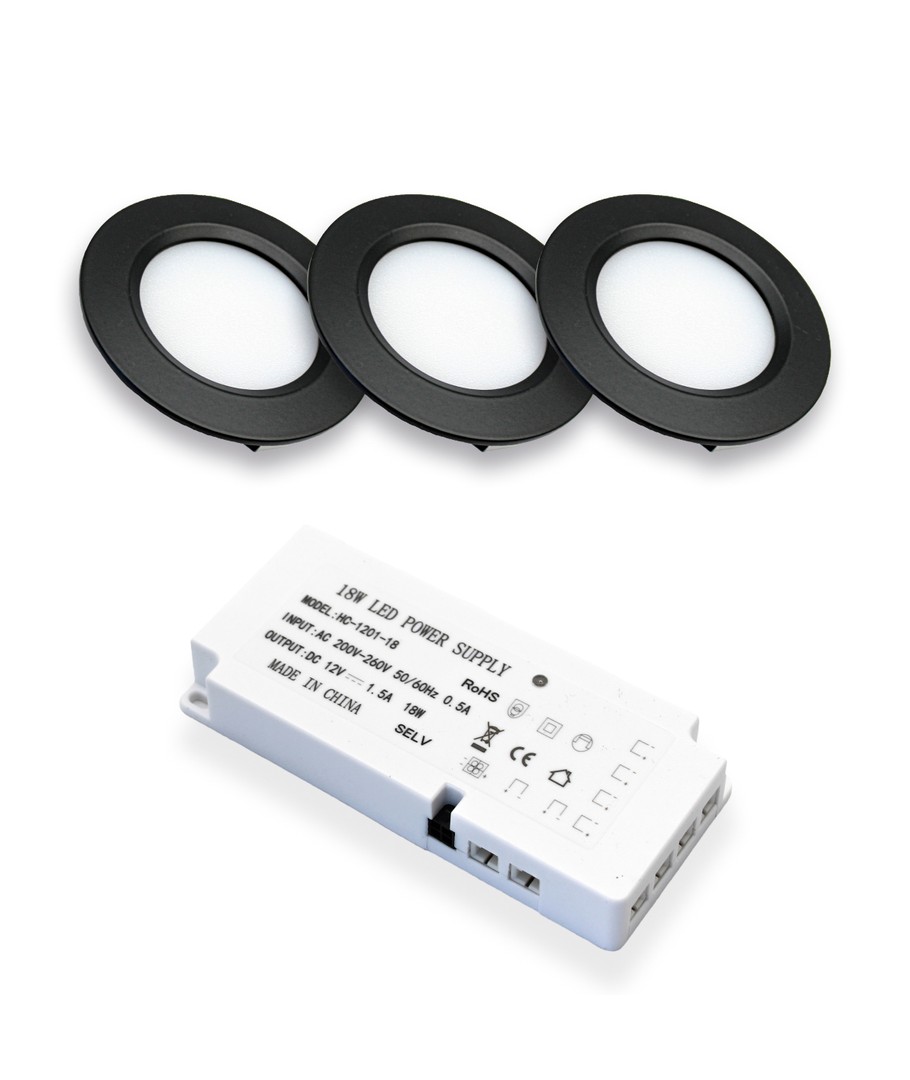 Med dette settet får du 3 stk. Reco68 møbelspots i sort, samt 12V DC strømforsyning, med plass til 6 møbelspots.