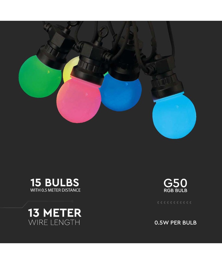 Opplev en fortryllende belysning med vår 7m LED lyslenke med 15 RGB pærer, som leverer en fargerik og energieffektiv løsning for både innendørs og utendørs bruk.