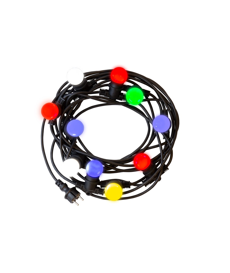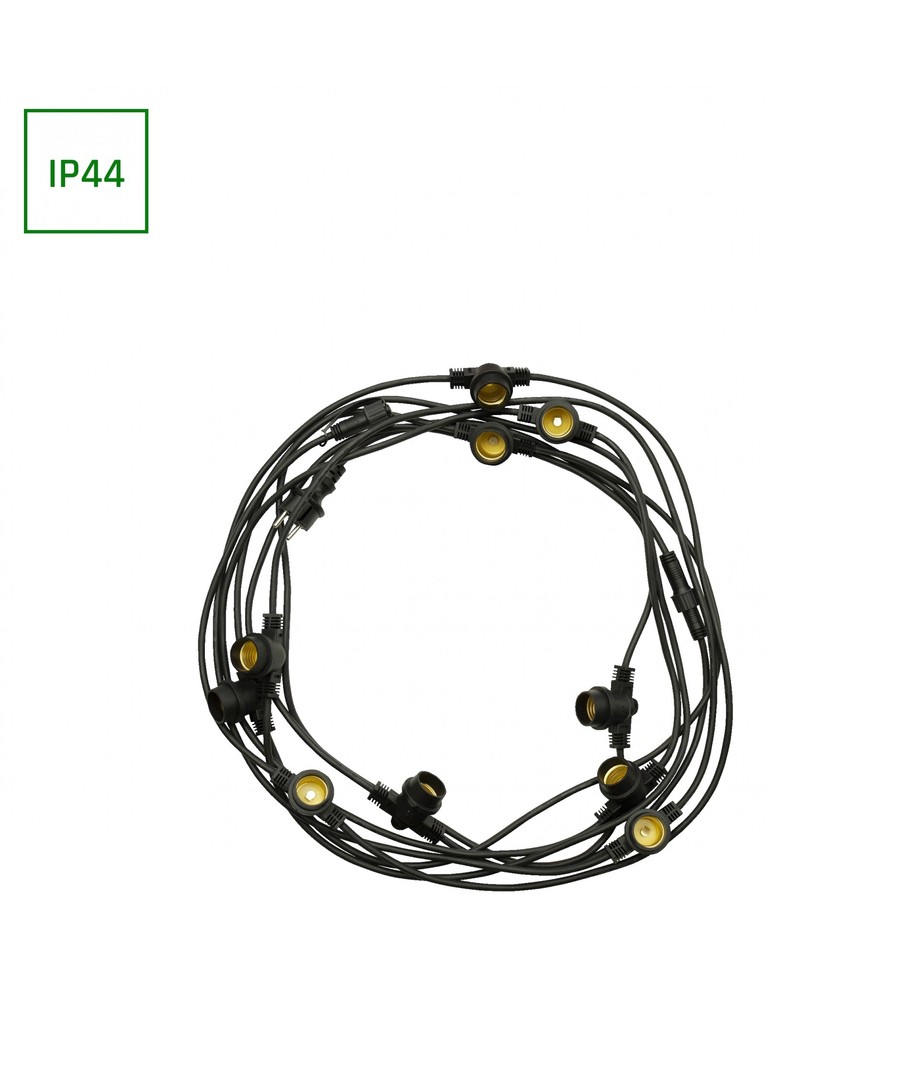 Skap en stemningsfull atmosfære både innendørs og utendørs med vår Spectrum lyskjede for 10 stk. E27 pærer. Denne 5 meter lange lysstrengen er IP44-klassifisert, noe som betyr at den kan brukes utendørs uten bekymringer.